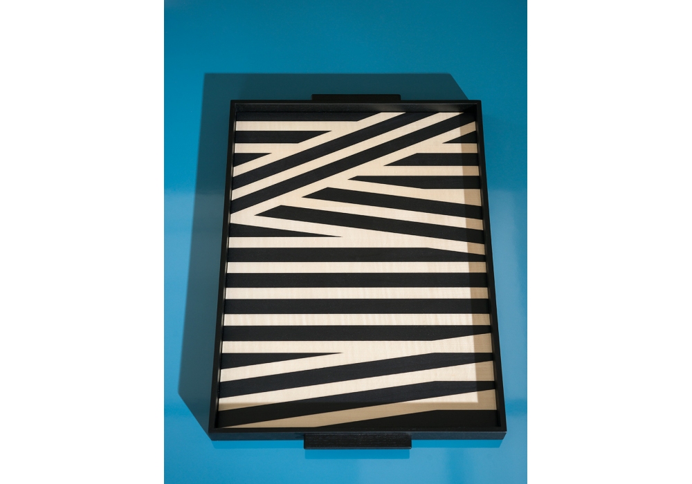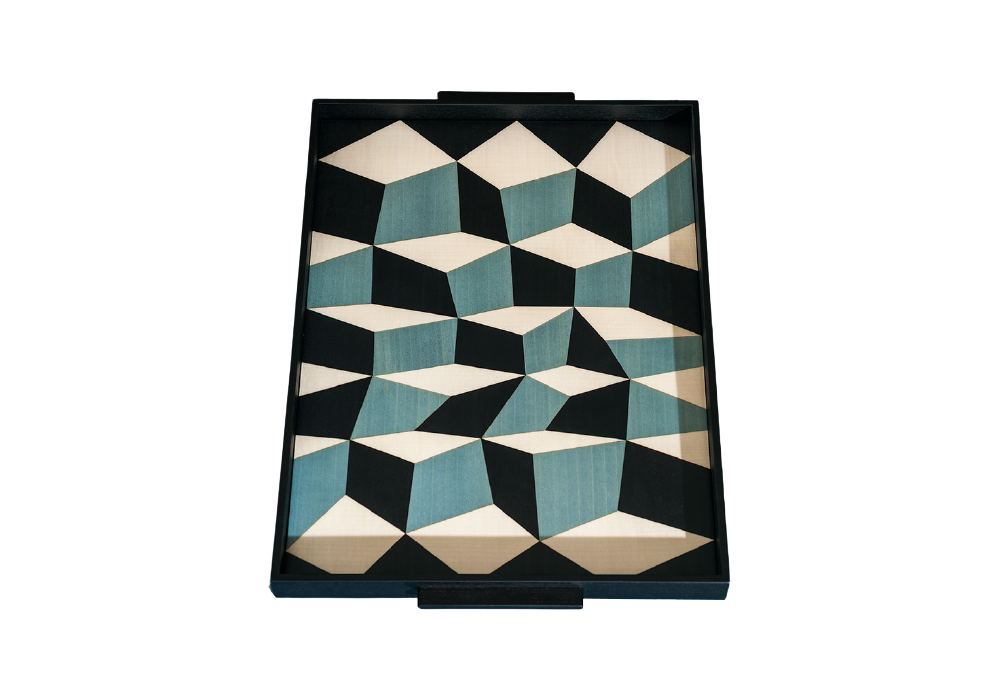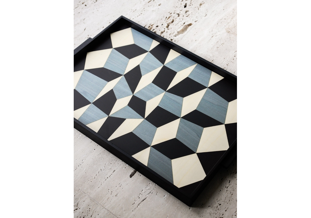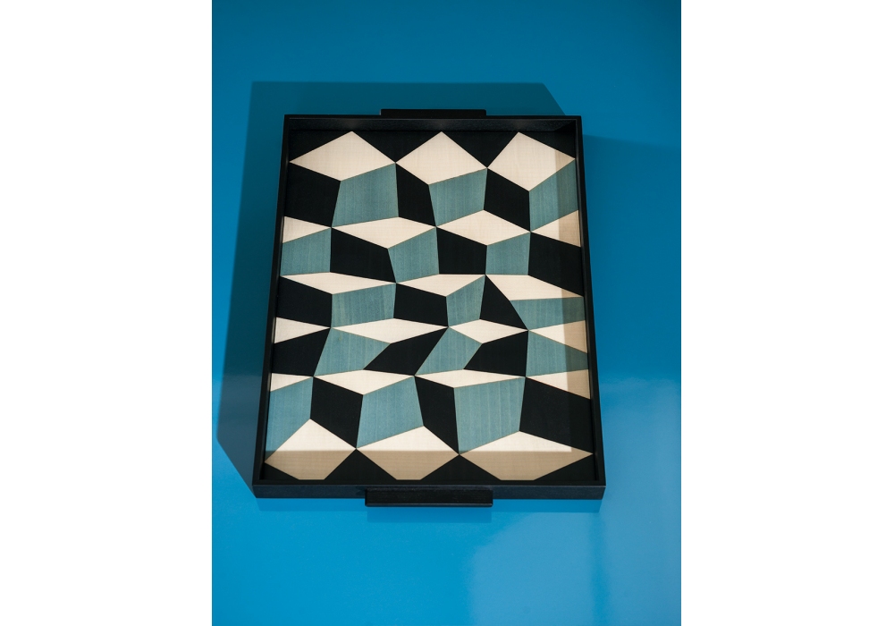 Tarsia, von Maria Gabriella Zecca für Tacchini entworfen, ist ein Holztablett, das in zwei Ausführungen mit geometrischen Mustern und Grafiken erhältlich ist.