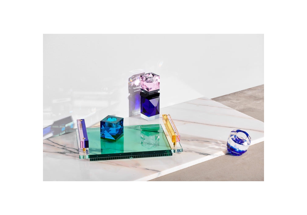 Panama hergestellt und signiert von Reflections Copenhagen, ist ein viereckiges Tablett aus Kristall, das aus verschiedenen geometrischen Elementen besteht, die von Hand in transparent, pink, kobalt, gelb und smaragd geschnitzt und veredelt wurden.