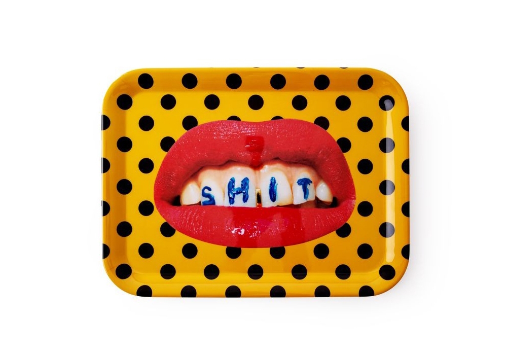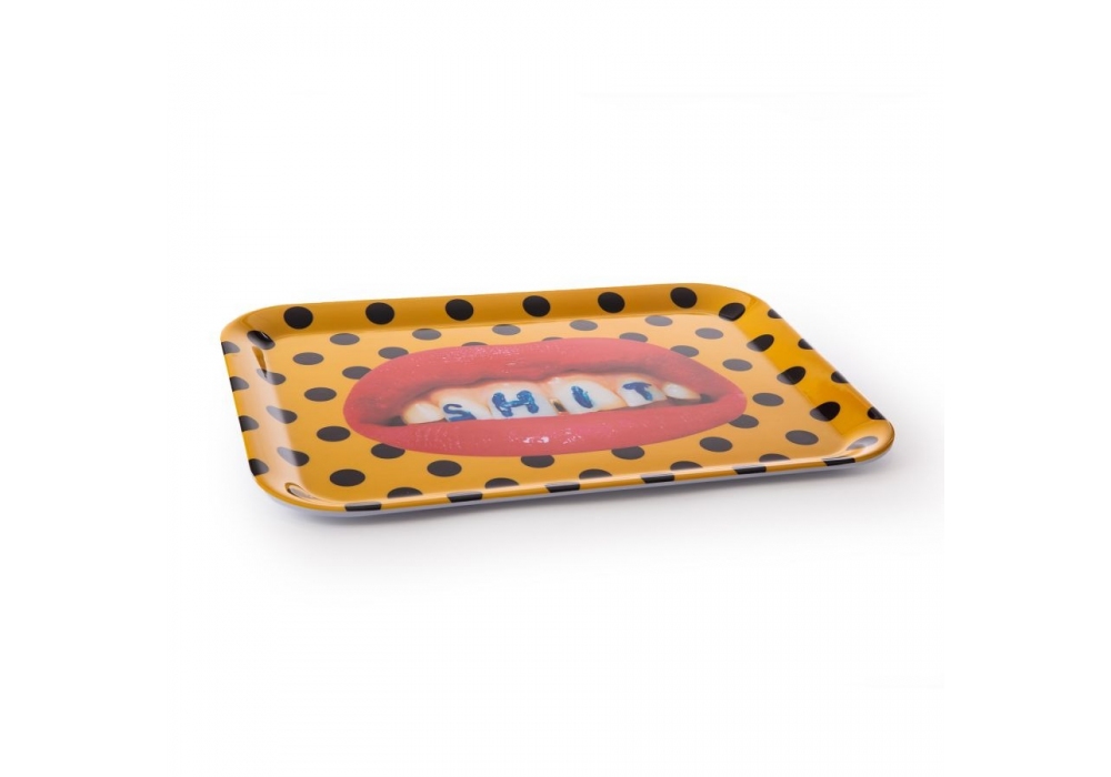 Shit von Toiletpaper für Seletti entworfen ist ein viereckiges Tablett mit abgeschrägten Ecken aus gelbem und schwarzem Melamin mit farbigem Aufdruck.