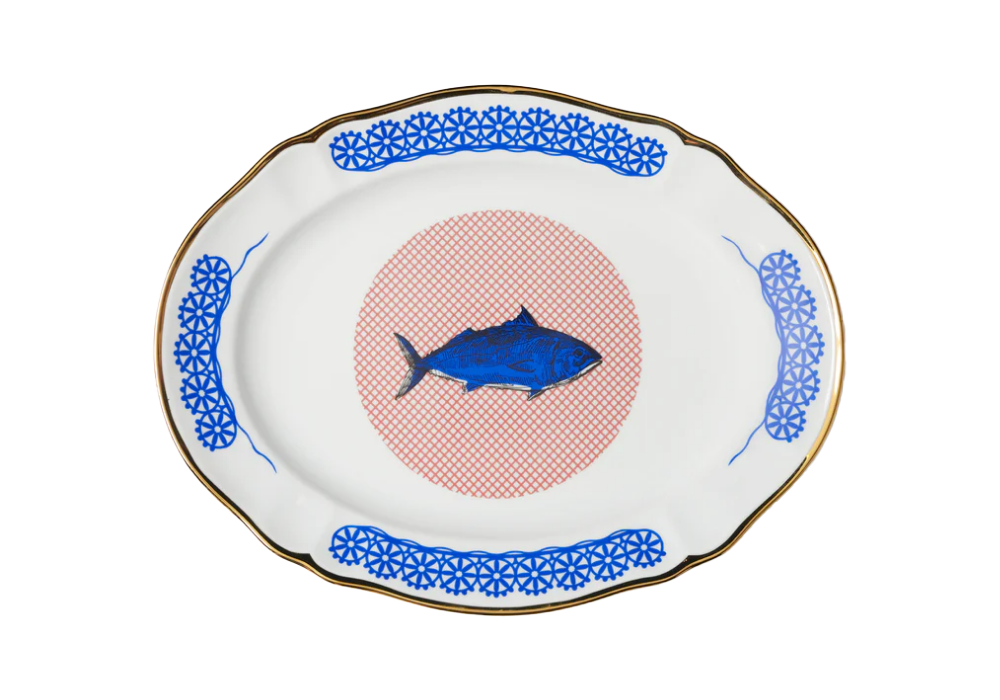 Pesce unterzeichnet von Design Sam Baron für Bitossi Home ist ein Tablett aus Porzellan mit goldenen Abziehbild und Details gemacht. Geeignet für die Spülmaschine und maximal 250 Wäschen. Nicht für die Mikrowelle geeignet.