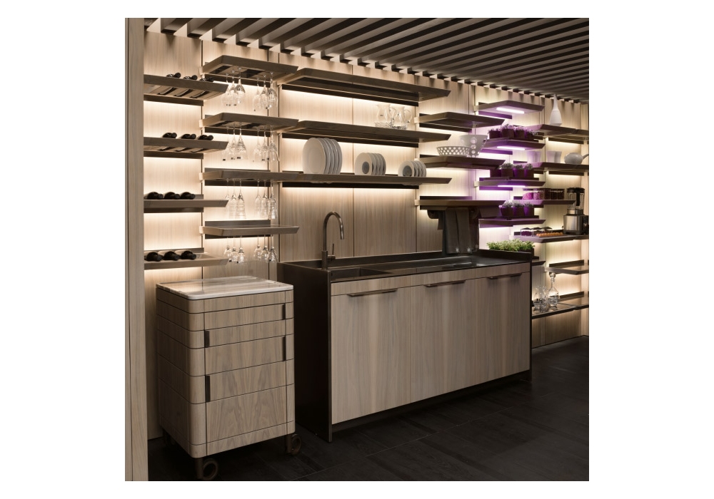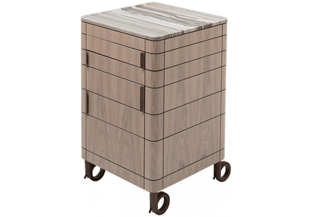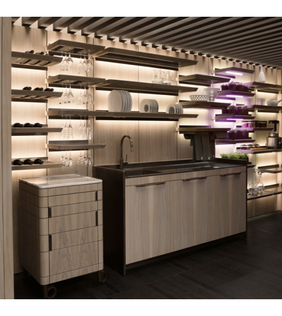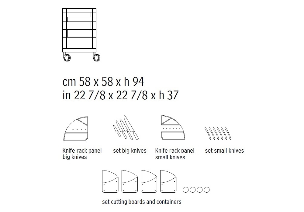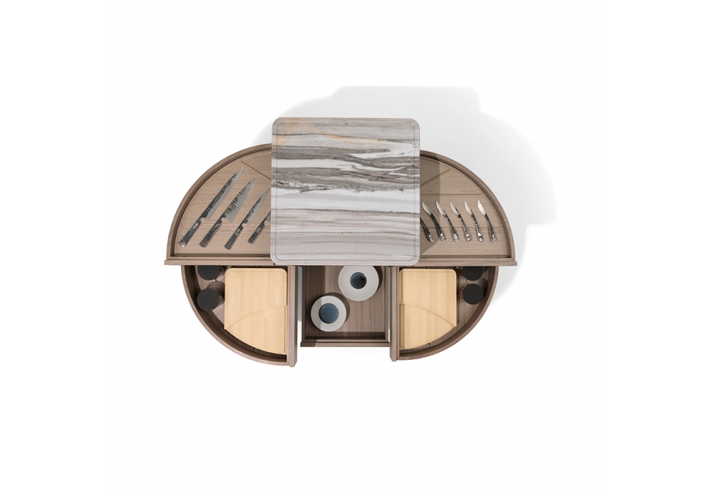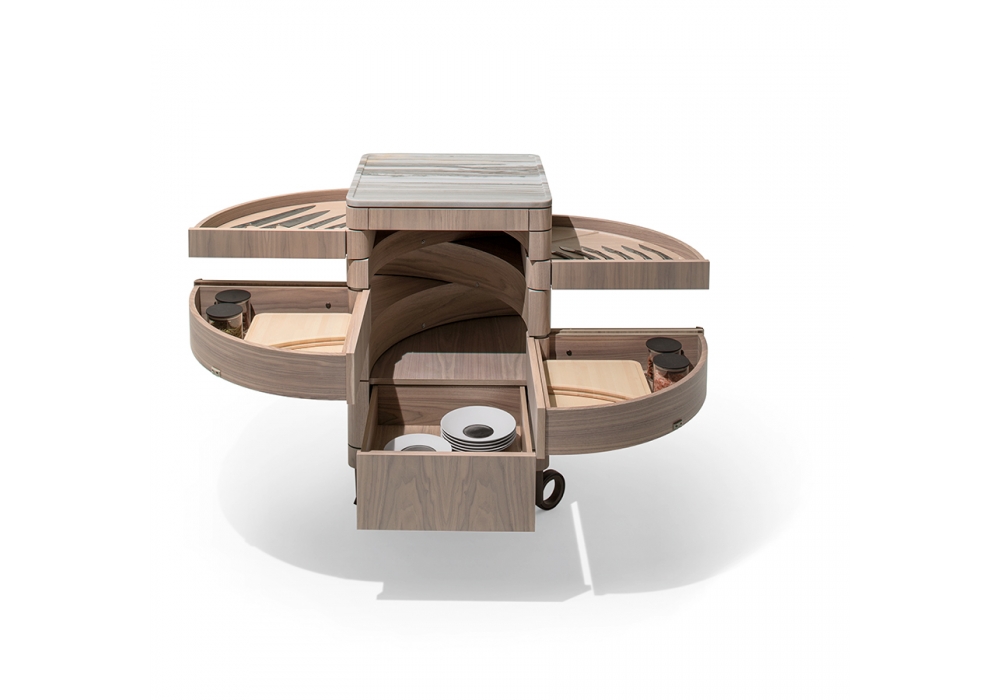 Alfred von Centro Ricerche Giorgetti entworfen, ist ein Servierwagen aus massivem Canaletto Nussbaum und Marmorplatte verfügbar in 3 verschiedenen Ausführungen. Stahlmesser in zwei Sets sind verfügbar als Zubehör: 4 große Kochmesser oder 6 kleine Messer. Messerständer aus Nussbaumholz inklusive.