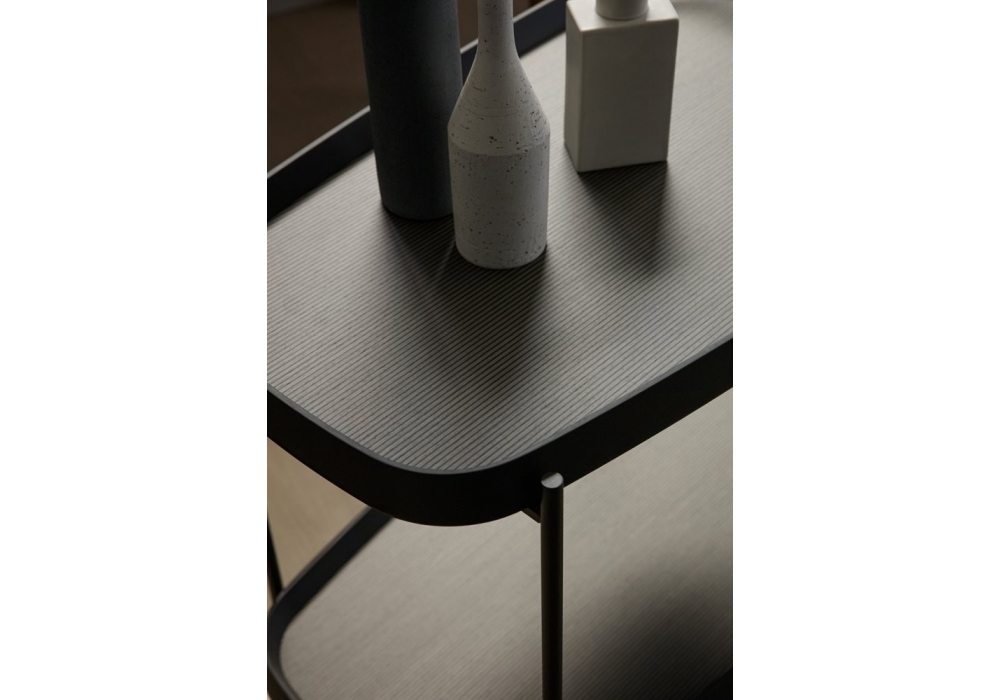 Jet von Carlo Ballabio für Porada entworfen, ist ein Servicewagen mit einer Basis aus mattschwarzem Metall und Holzplatten mit einem Rahmen aus massivem Canaletta-Nussbaum. Die Innenseite der Tops kann aus Canaletta-Walnuss, Hochglanzlack oder mit Mikrostreifen-Inlay-Arbeiten bestehen. Erhältlich in verschiedenen Modellen.