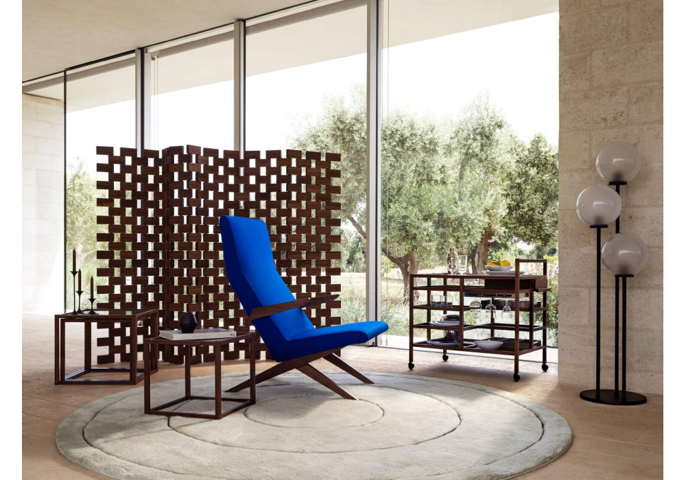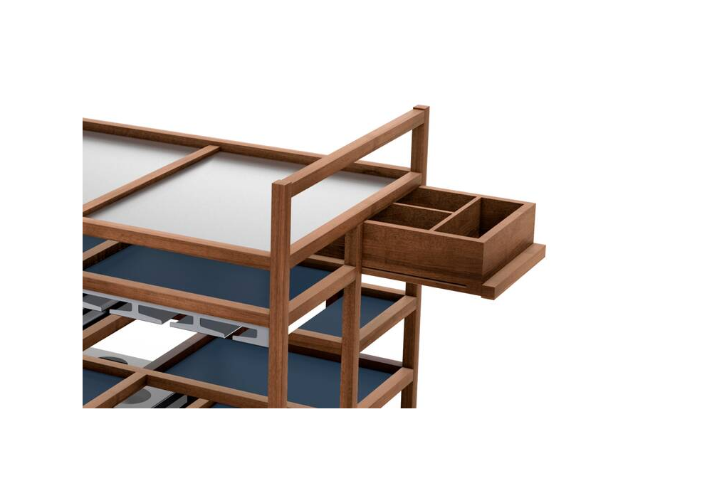 657 Serving Cart von Bodil Kjær für Cassina entworfen, ist ein Servicewagen mit Rädern mit unteren Regalen aus laminiertem HPL und einer Struktur aus massivem Holz. Die oberen Regale und Zubehörteile sind immer aus gebürstetem Edelstahl.