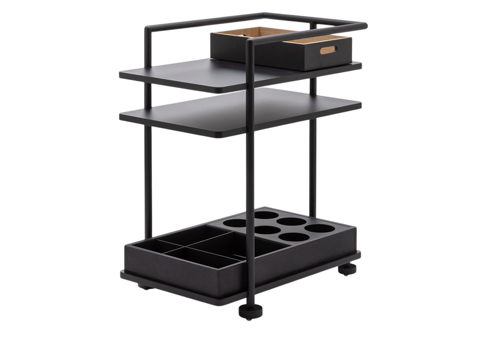 Aero T Design von Shibuleru für Living Divani, ist ein Servierwagen mit zwei Ablagen und einem offenen Behälter in einer mattschwarzen Metallstruktur. Die Lenkrollen sind mit Gummi überzogen. Die Ablagen bestehen aus MDF mit kratzfestem Rahmen. Der offene Behälter besteht aus einer MDF-Platte und einem mit schwarzem Leder überzogenen HPL-Rahmen, der an der Platte befestigt ist. Innenseiten, Kanten und Boden des Tabletts sind in verschiedenen Ausführungen erhältlich.