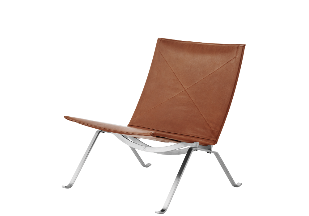 PK22 von Poul Kjærholm für Fritz Hansen entworfen, ist ein Sessel aus Korbgeflecht, Segeltuch oder Leder und Struktur aus gebürstetem satiniertem Edelstahl.