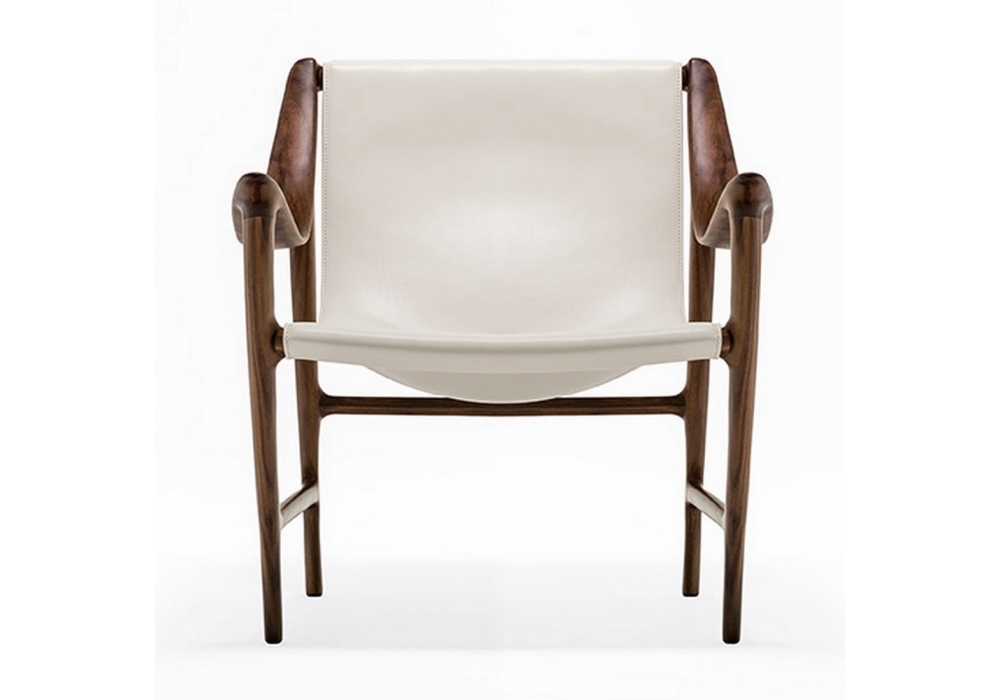 Swing von Carlo Colombo für Giorgetti entworfen, ist ein Sessel mit einer Struktur aus massivem Canaletto-Walnussholz. Die Sitzstruktur besteht aus Polyurethanschaum und die Polsterung aus flexiblem Polyurethan. Die Polsterung besteht aus Leder und ist nicht abnehmbar.