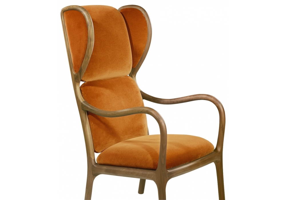 Bergère 30 von Jaime Hayon für Ceccotti Collezioni entworfen, ist ein Sessel aus massivem amerikanischem Nussbaum, gepolsterter Sitz und Rückenlehne aus gebogenem Sperrholz beplankt aus Stoff oder Leder. Auch verfügbar in 2 Versionen: mit oder ohne Pouf.