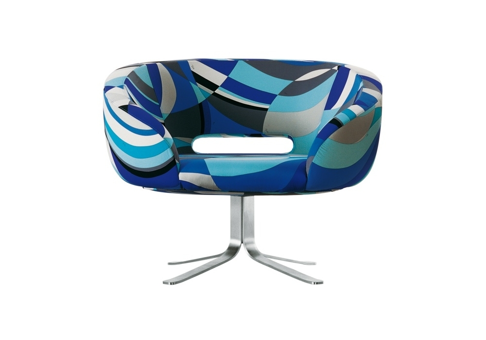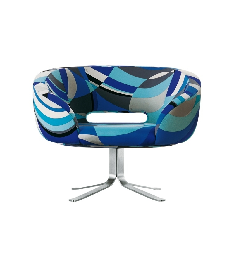 Rive Droite von Patrick Norguet für Cappellini entworfen, ist ein Sessel mit Drehgestell aus gebürstetem Edelstahl. Feste Bezug aus Stoff, Leder und einer Auswahl an Stoffen, entworfen von Emilio Pucci. Verfügbar in mehreren Ausführungen.