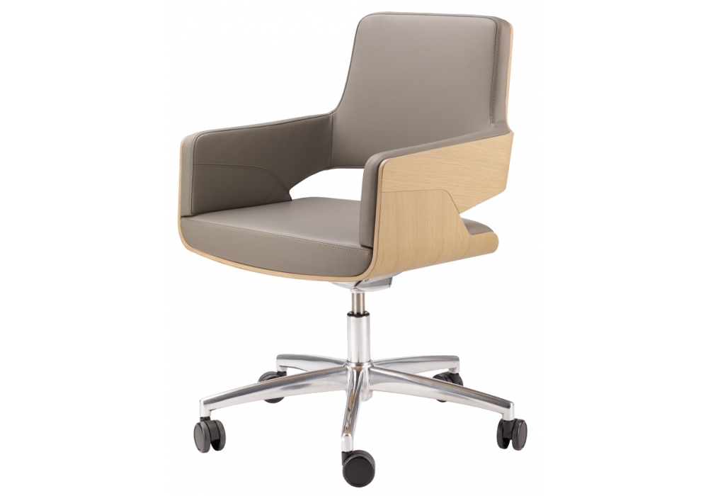S 845 DRW von Lepper Schmidt Sommerlade für Thonet entworfen, ist ein Drehsessel mit Rollen, Gestell aus poliertem Aluminium und Kippmechanismus. Gepolsterter Sitz und Rückenlehne mit Stoff-, Leder- oder Rindslederbezug. Außenschale aus hell lackierter Eiche oder Nussbaum. Verstellbare Höhe.
