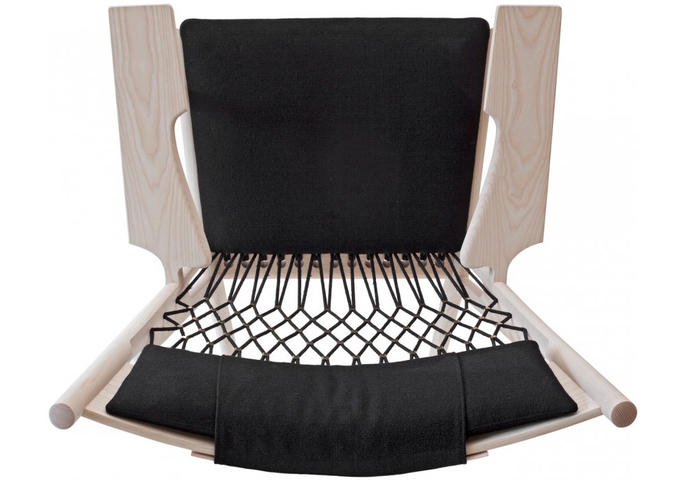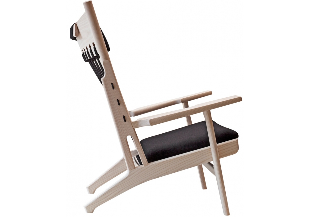 PP129 Web Chair designed by Hans J. Wegner for PP Møbler is an easy chair with flag halyard in nature or black. The clips connecting the flag halyard come in stainless steel, brass or black. Seat and neck cushions come in fabric or leather, and the cover for the neck cushion comes in a range of fabrics specifically suited for carrying the cushion.
