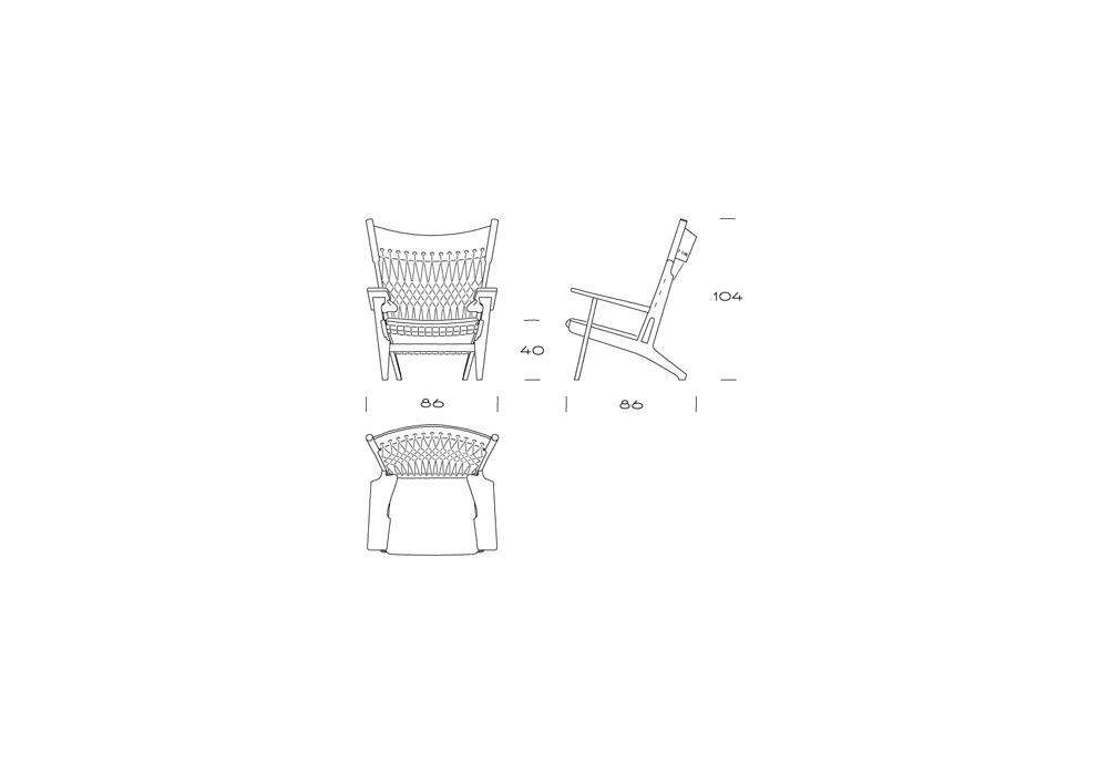 PP129 Web Chair designed by Hans J. Wegner for PP Møbler is an easy chair with flag halyard in nature or black. The clips connecting the flag halyard come in stainless steel, brass or black. Seat and neck cushions come in fabric or leather, and the cover for the neck cushion comes in a range of fabrics specifically suited for carrying the cushion. Wegner’s primary material was always solid wood. Nevertheless, having designed the pp550 Peacock Chair in 1947, it was not until 1968 that Wegner created an expressive easy chair with solid wood as the dominant material, namely the Web Chair. Its playful and ample armrests immediately bring to mind Wegner's sense of joy at shaping solid wood, while at the same time the chair manifests the distinct idea of transparency in a nonetheless sturdily constructed and comfortable easy chair.
