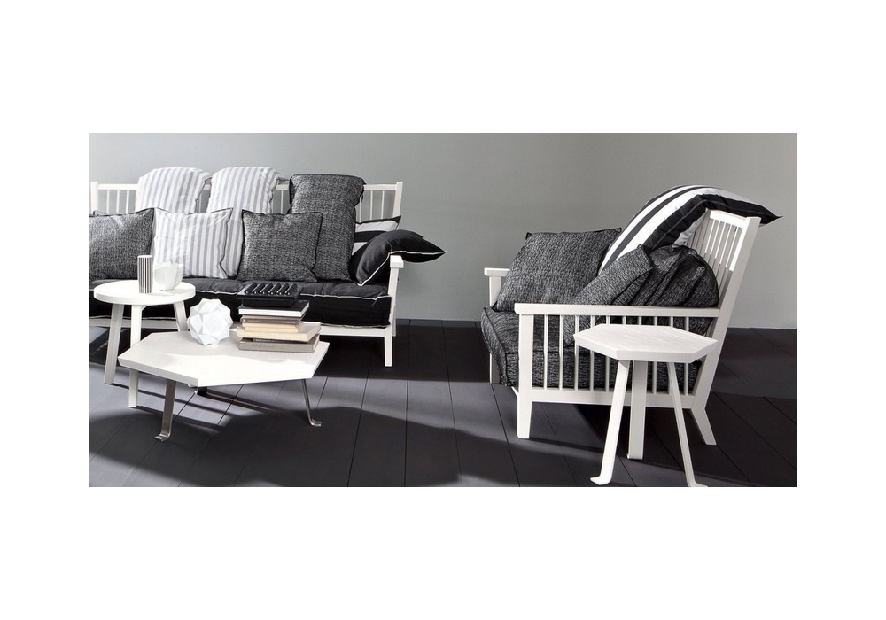 Gray 01 von Paola Navone für Gervasoni entworfen, ist ein Sessel mit Struktur aus Nussbaum oder Eiche, die Kissen sind mit Stoffbezug gemischt.