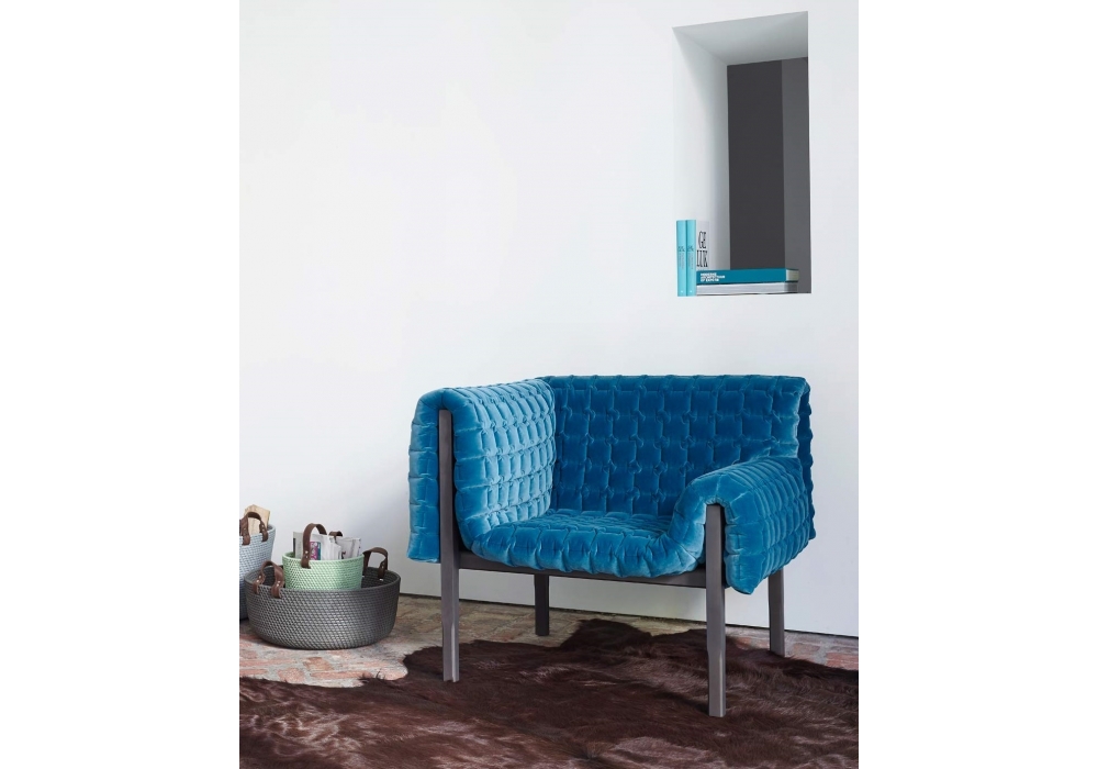 For Ligne Roset, Ruché (the name refers to a gathered or pleated fabric which serves as a decoration on a piece of clothing) designed by Inga Sempé brings together the unusual and the traditional. The unusual thing about this piece is its solid wood structure, and the great traditional element: the quilting, the very heart of its savoir-faire. Its rangy uprights and the undulations of its duvet combine to produce a harmonious union of rigorous straight lines and soft, welcoming curves.