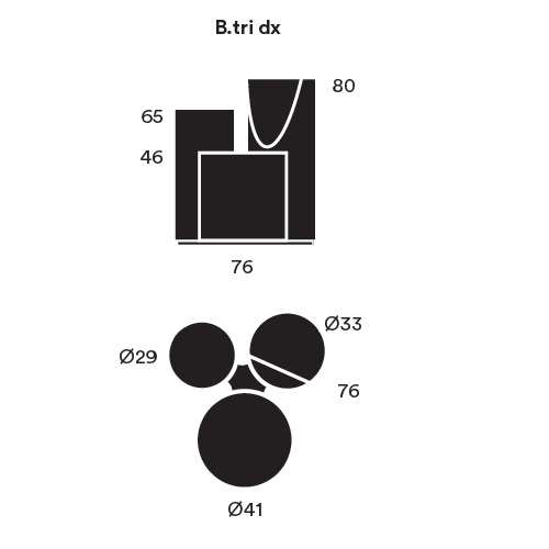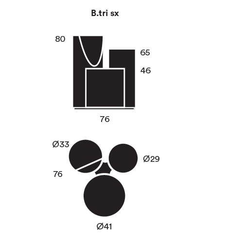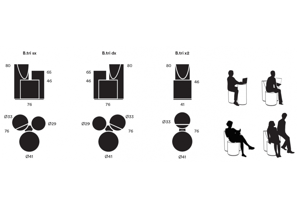 B.tri von Bruno Rainaldi für Opinion Ciatti entworfen, ist ein dekonstruierter Sessel bestehend aus zwei oder drei gepolsterten Zylindern unterschiedlicher Höhe, die durch eine schwarze Stahlbasis verbunden sind. Bezug verfügbar in mehreren Stoffen oder Ledern.