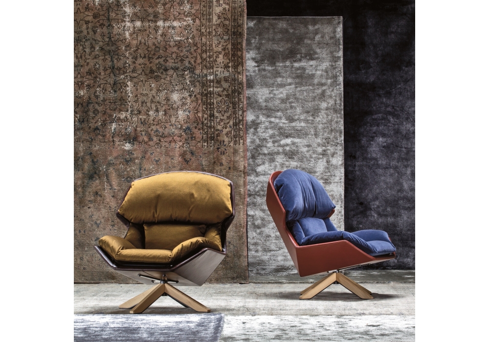 Clarissa von Patricia Urquiola für Moroso entworfen, ist ein Sessel mit Drehgestell aus Stahl mit Verschalung in Esche oder Eiche. In der Holz-Ausfuehrung ist der Metallfuß immer lackiert Kanonengrau. Ein Sitzmöbel und sein Double: einerseits umgibt es und schützt, andererseits entspannt es und nimmt auf. Eine auffällige Ambivalenz, die auf künstliche Weise Form und Inhalt und Erscheinungsbild und Konzept trennt. Nicht zufällig wies der anfängliche Name – hood, Kapuze – auf eine doppelte Funktion hin.