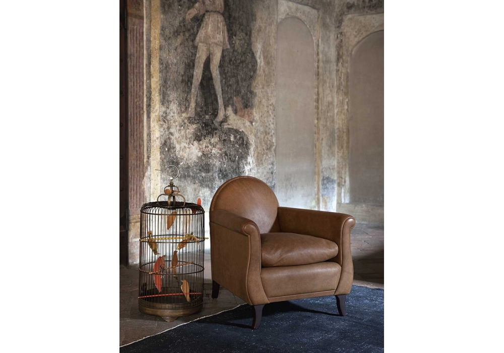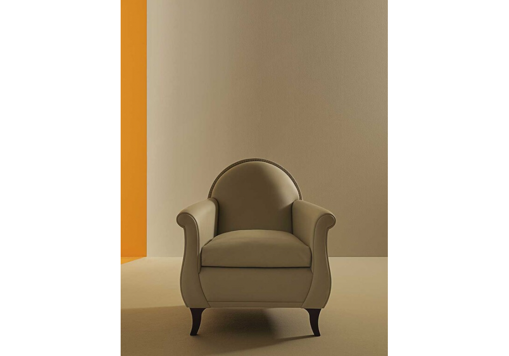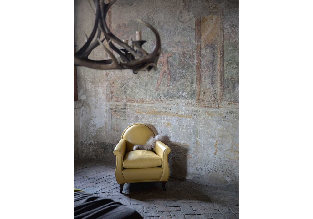 Lyra, von Poltrona Frau entworfen, ist ein Sessel mit einer Struktur aus abgelagertem Buchenholz und einem Sitzkissen mit Gänsedaunenfüllung. Die Füße sind in den folgenden Ausführungen erhältlich: Buche dunkel nussbaumfarben gebeizt und schwarz lackiertes Holz. Polsterung in Pelle Frau® Leder oder Stoff. Die äußere Rückenlehne und die obere Innenkante der Rückenlehne sind mit einer Reihe von lederbezogenen Nägeln versehen. 24 kt galvanisch getauchte Goldplatte.
