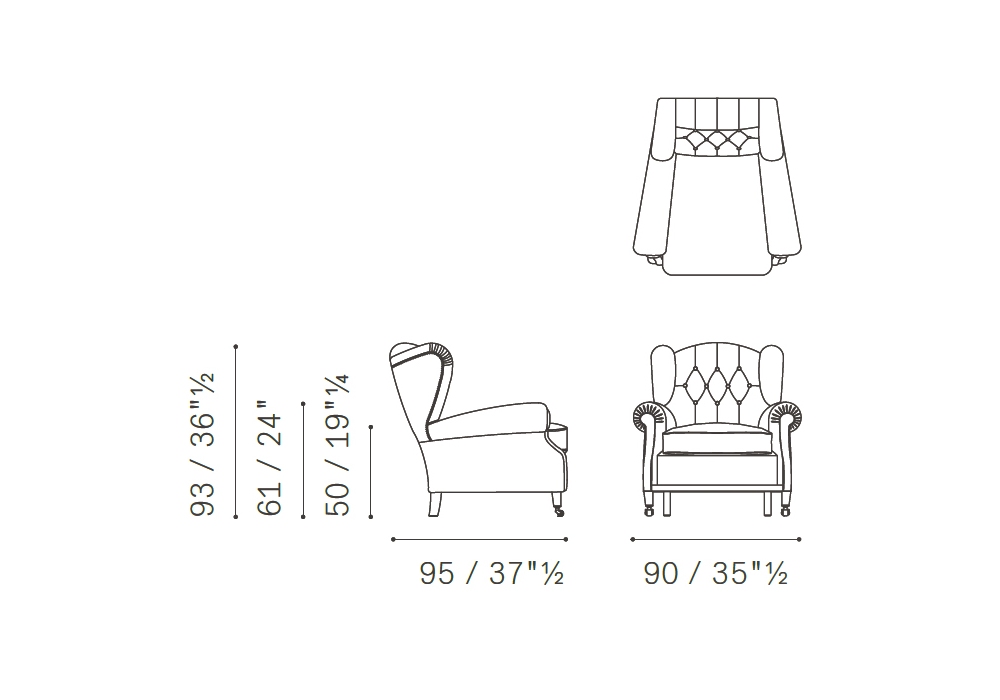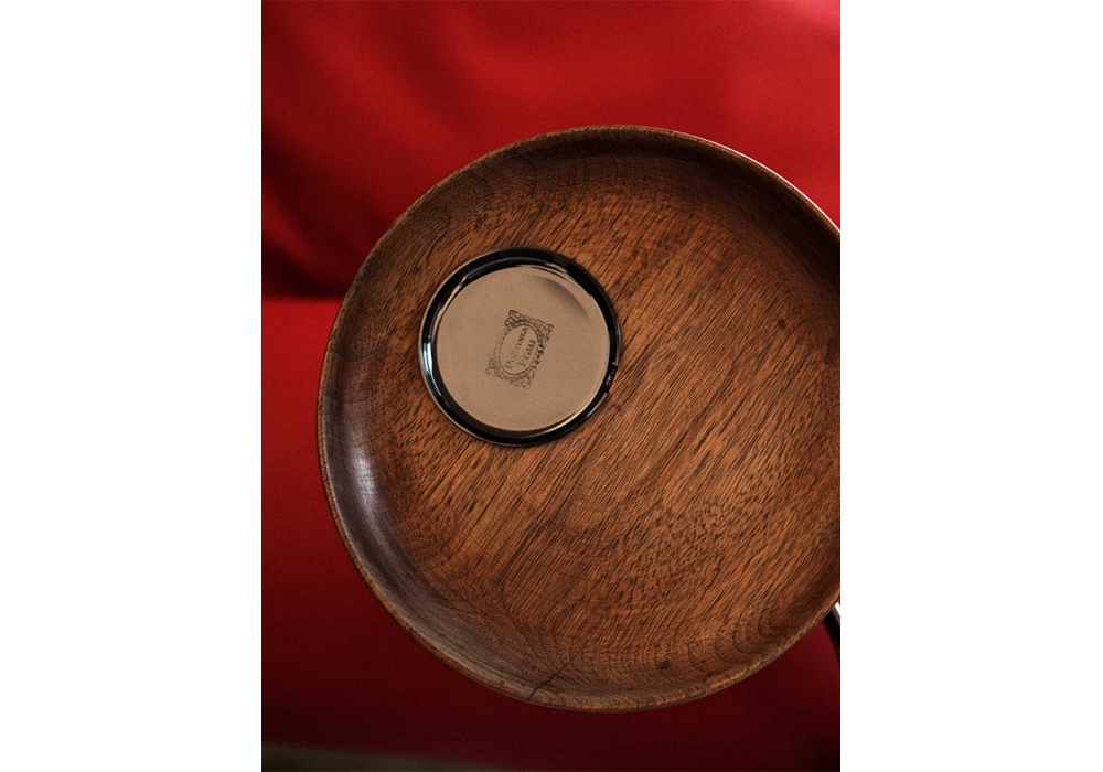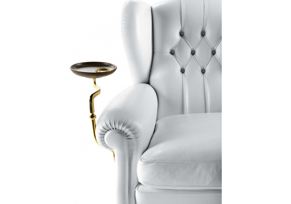 1919, von Poltrona Frau entworfen, ist ein Sessel mit einem Gestell aus abgelagertem Buchenholz und einem Sitzkissen mit Gänsedaunenfüllung. Die hinteren Füße sind aus dunklem, nussbaumfarben gebeiztem Buchenholz und die vorderen Füße haben Räder aus Messing in goldener oder grauer Ausführung. Dieser Sessel ist in folgender Ausführung erhältlich: ohne Platte oder mit Aschenbecher/Glashalter (rechts oder links). Die Rückenlehne hat ein handgefertigtes Capitonné-Design. Die äußere Rückenlehne des Sessels ist mit einer Reihe von lederbezogenen Nägeln versehen. Polsterung aus Pelle Frau®-Leder.