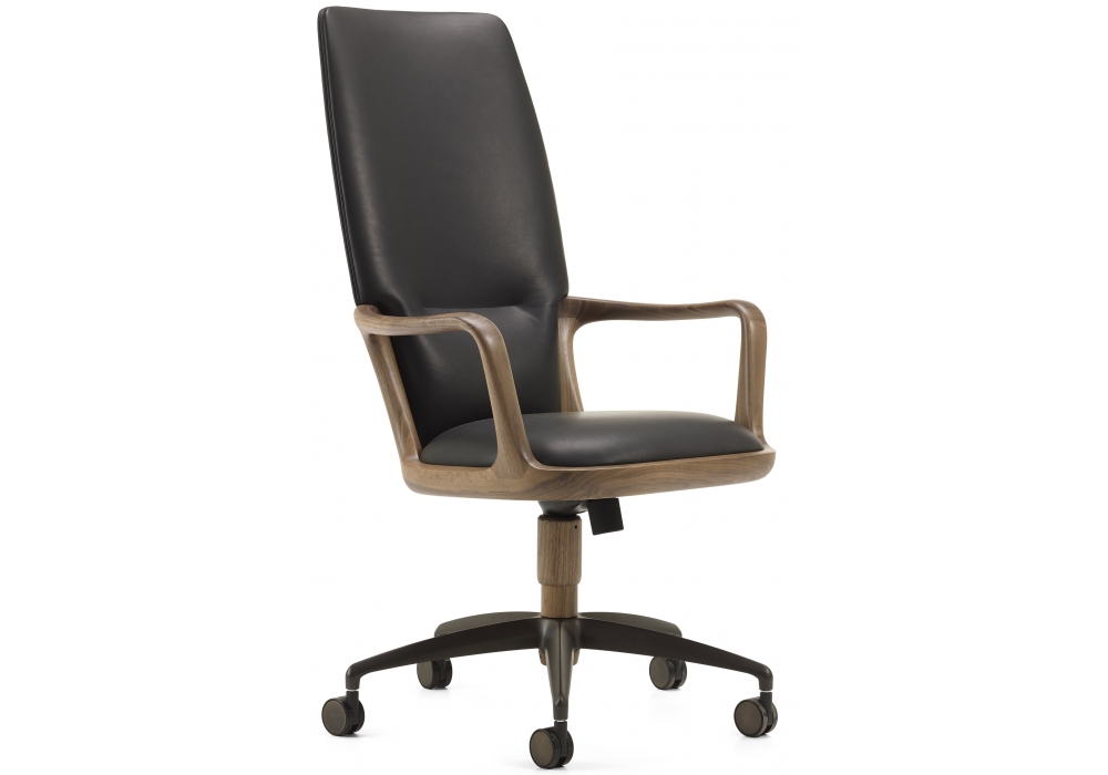 Vossia von Giuseppe Casarosa für Ceccotti Collezioni entworfen, ist ein Drehsessel mit Struktur aus massivem amerikanischem Nussbaum. Bezug aus Stoff, Leder oder Naturleder. Basis aus Aluminium mit Messing-Bronze Ausführungen. Basis mit 5-Speichen mit Rollen. Auch verfügbar in 3 Abmessungen.