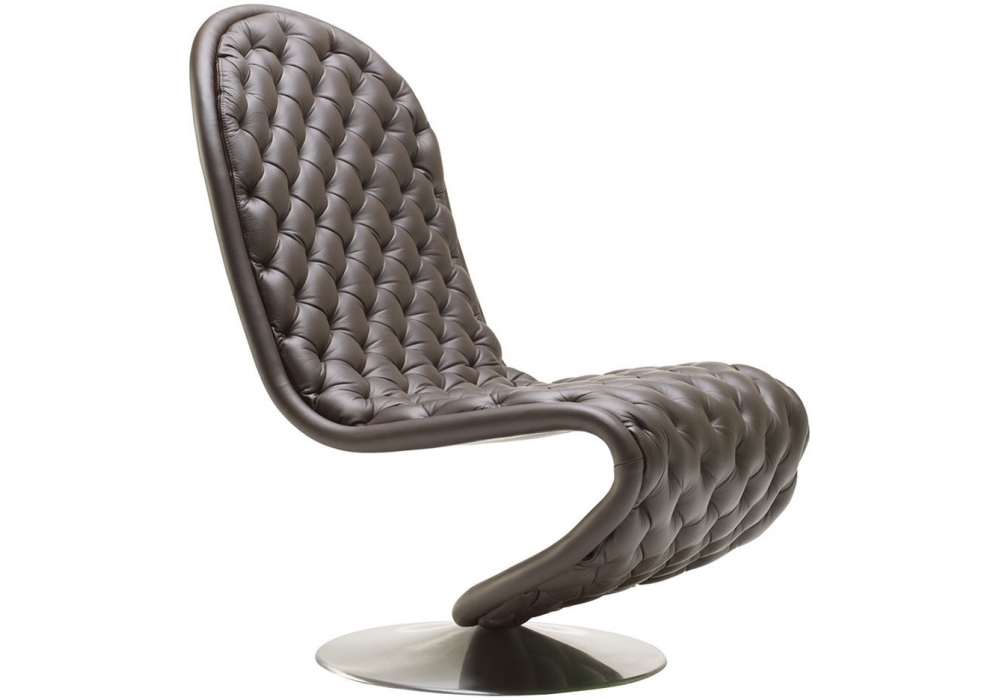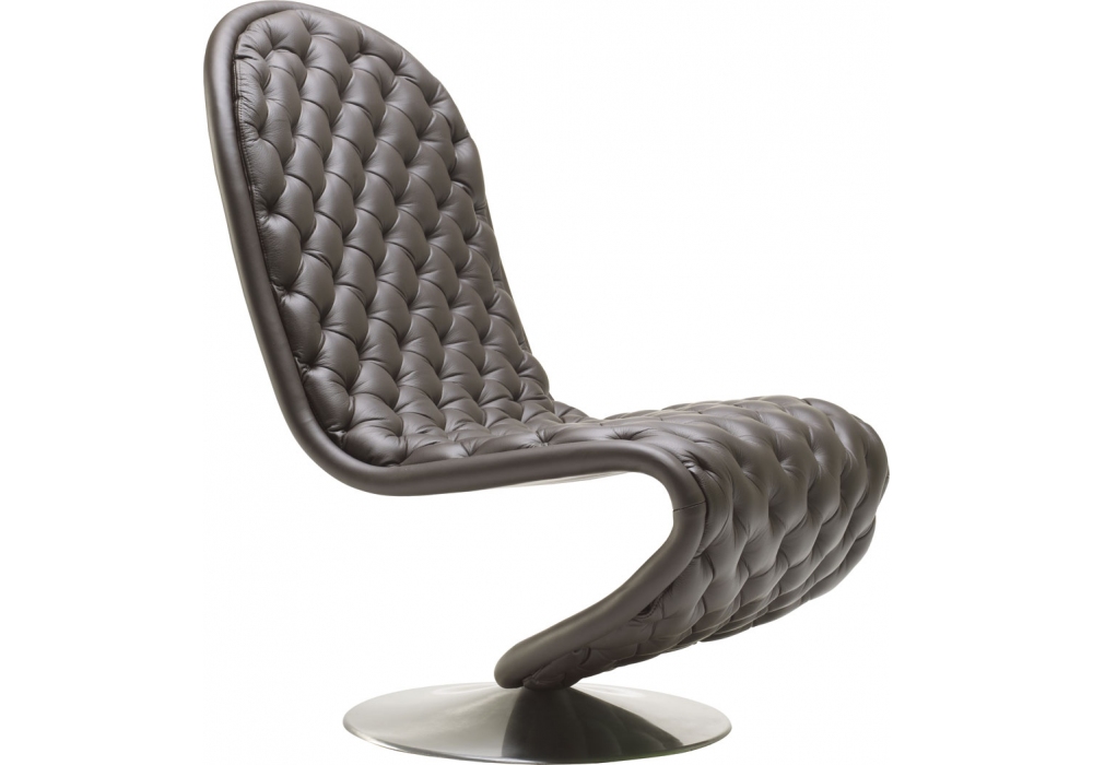 System 1-2-3 Lounge Deluxe, von Verner Panton für Verpan entworfen, ist ein S-förmiger Sessel mit runder Basis aus gebürstetem Aluminium und Polsterung, die in verschiedenen Stoffen und Ledern verügbar ist.