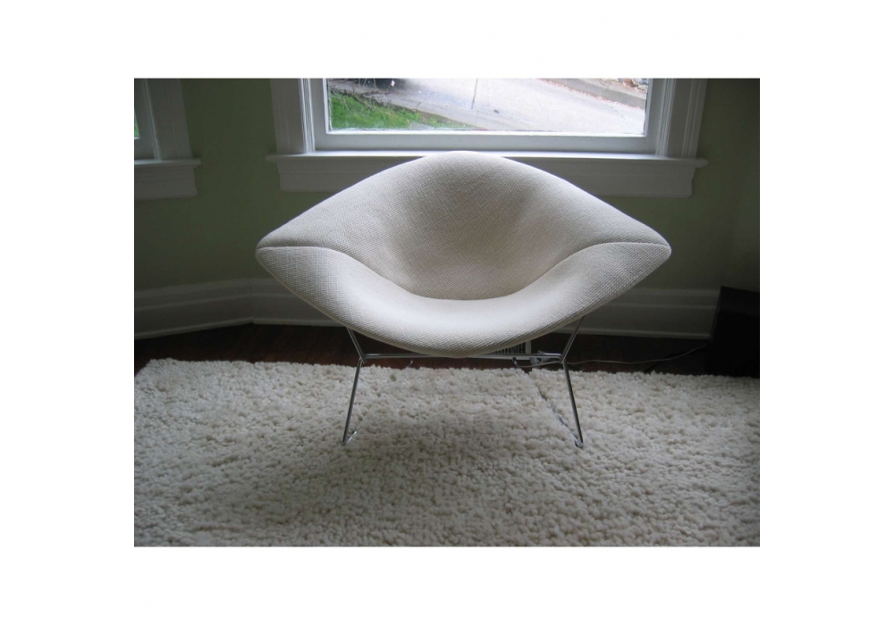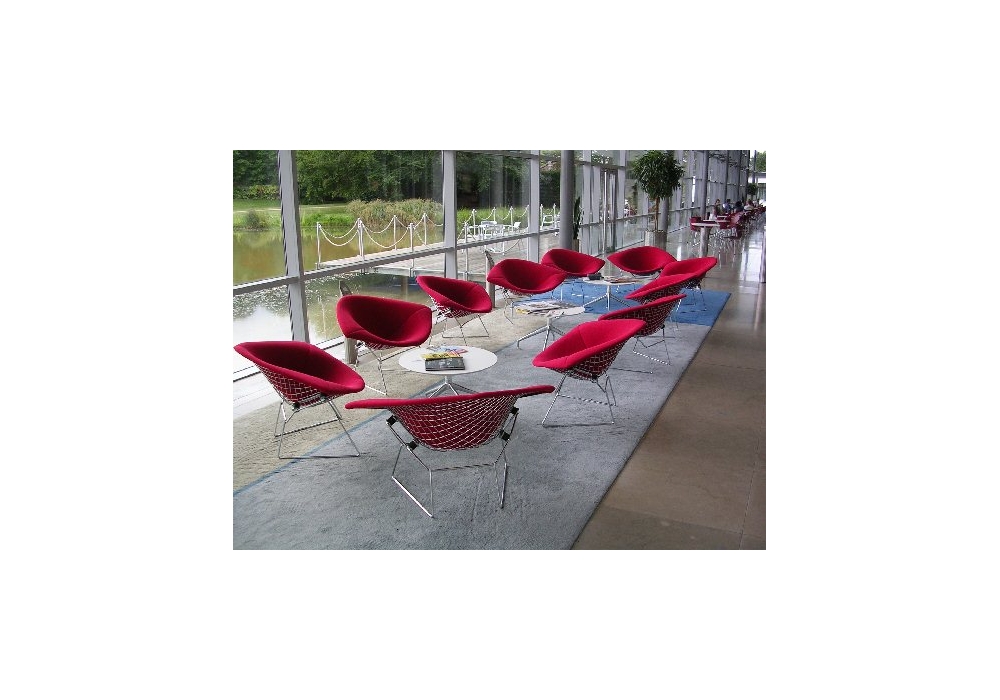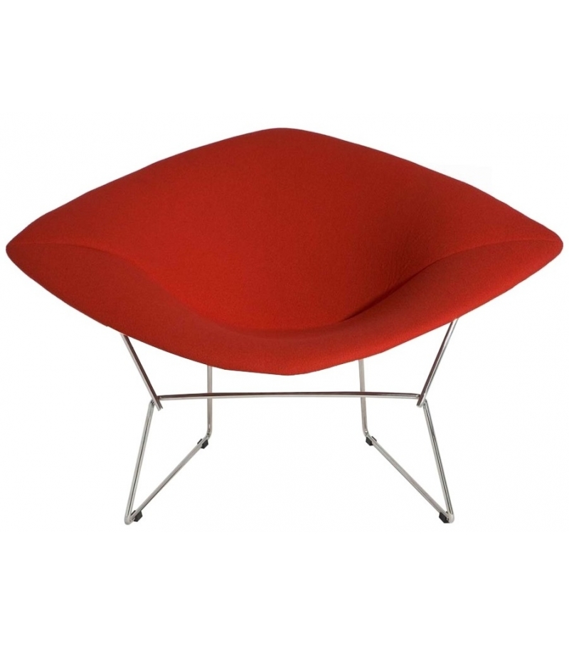Bertoia Large Diamond von Harry Bertoia für Knoll entworfen, ist ein Sessel mit einer an jedem Knotenpunkt verschweißten Stahlstangenstruktur mit poliertem Chrom- oder Rilsan-Finish. Polsterung in verschiedenen Stoffen oder Ledern.