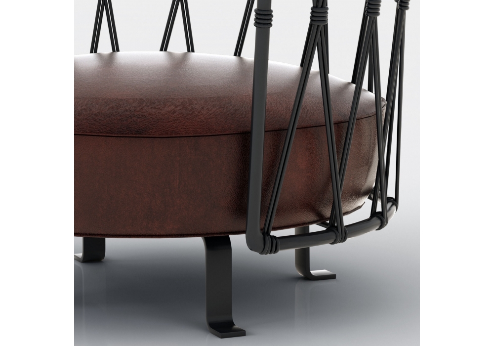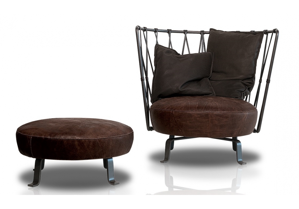 Pedro von Roberto Lazzeroni für Baxter entworfen, ist ein schöner Sessel mit matt schwarz lackierten Metallrahmen. Polyurethanschaumpolsterung mit 100% Acrylfaser Polyester. Rückenlehne mit rundem Lederbandgewebe, dunkelbraune Farbe. Drehbasis. Kissen 50 x 70 cm enhalten.