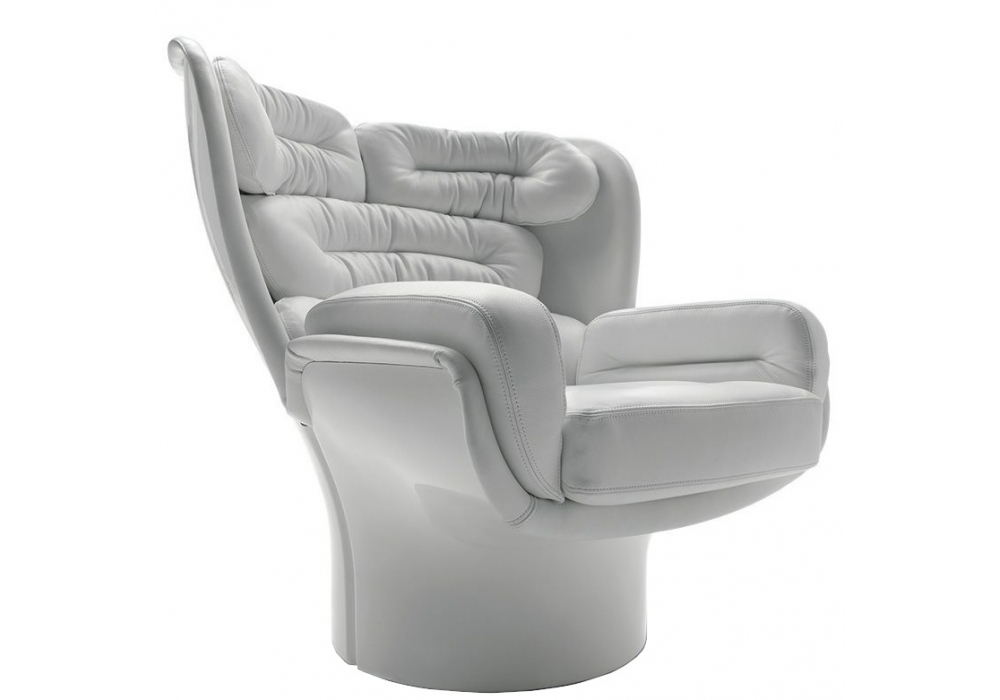 Elda von Joe Colombo für Longhi entworfen, ist ein Sessel mit 360° drehbarer Schale aus handgefertigtem Fiberglas, Innenbezug aus nicht abnehmbarem Leder oder Stoff, gepolstert mit anatomisch geschäumtem Polyurethan unterschiedlicher Dichte, bezogen mit Dacron. Auf Wunsch ist er mit Metallschale oder komplett mit Leder bezogen erhältlich.