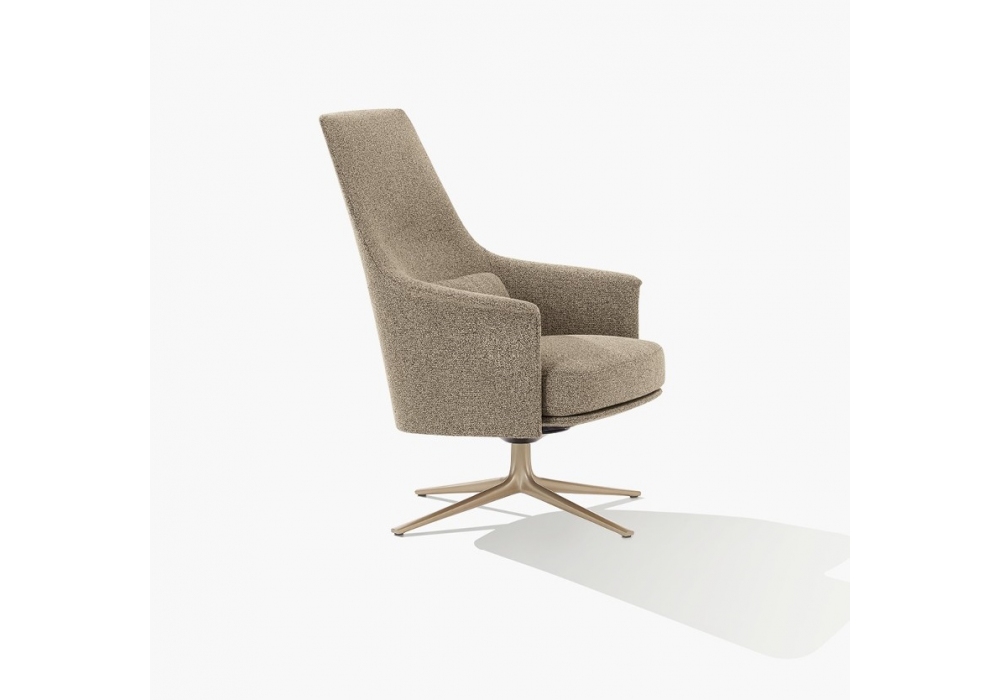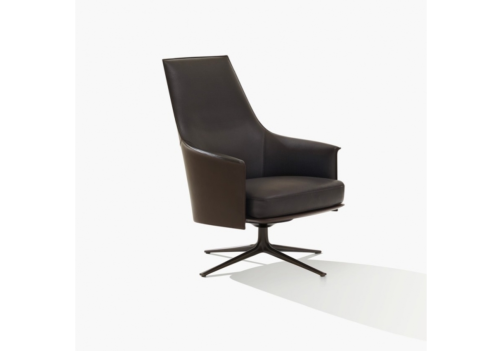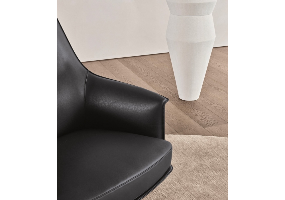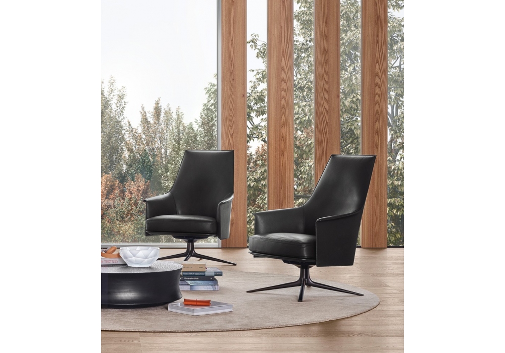 Stanford Lounge von Jean-Marie Massaud für Poliform entworfen, ist ein Sessel mit Drehfuß mit Rückholfunktion, einer kompakten Polyurethanstruktur und einem Sitzkissen aus flexiblem Polyurethan mit unterschiedlicher Dichte. Bezug aus Stoff, Leder oder Fell mit passender Lederaußenseite.