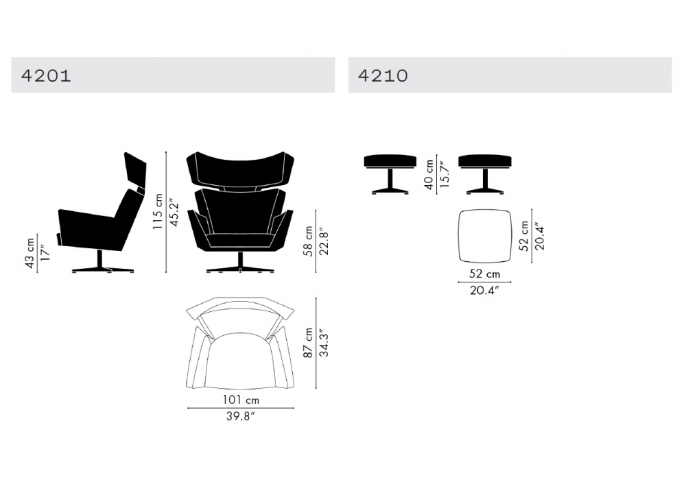 Oksen von Arne Jacobsen für Fritz Hansen entworfen, ist ein komplett mit Leder bezogener Drehsessel. Das Fünfstern-Fußkreuz ist in schwarz pulverbeschichtetem Aluminium oder satiniertem Aluminium mit Stahlsäule erhältlich. Verfügbar mit oder ohne Fußstütze in Kombination mit dem Sessel.