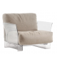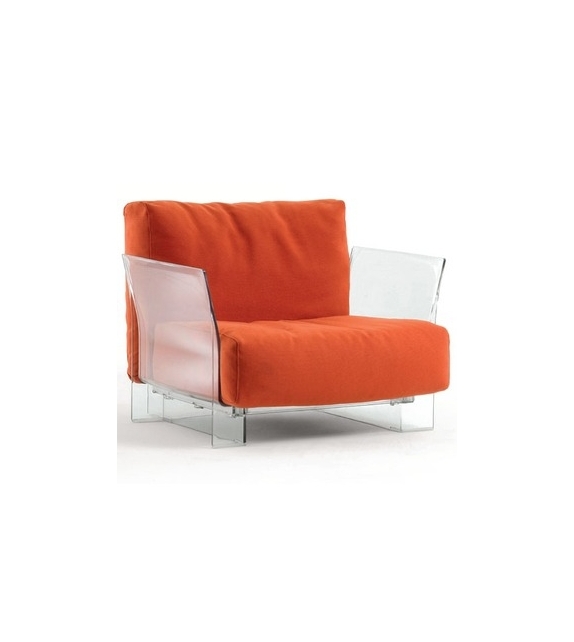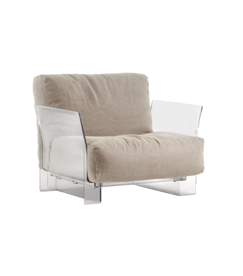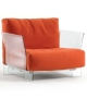 Pop Cotone von Piero Lissoni und Carlo Tamborini für Kartell entworfen, ist ein Sessel mit transparenter Polycarbonatstruktur und Sitz- und Rückenkissen aus Gänsedaunen und Schleife. Abnehmbarer Bezug aus einfarbiger Baumwolle.
