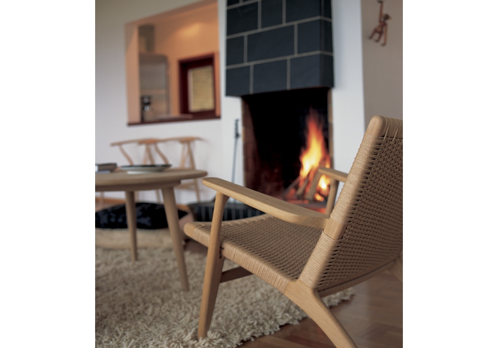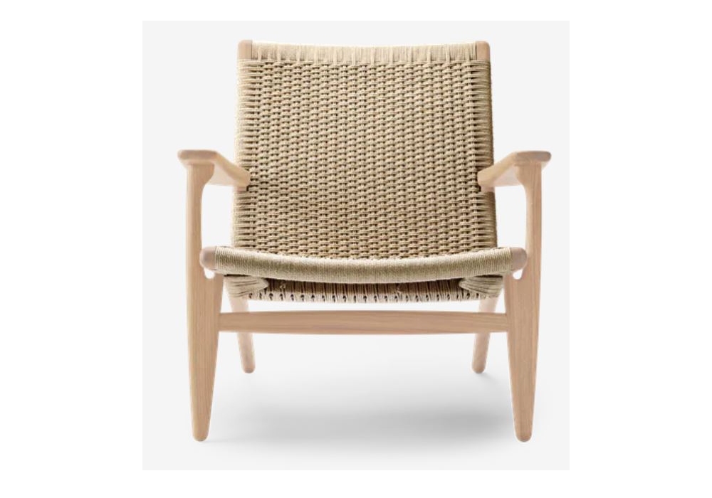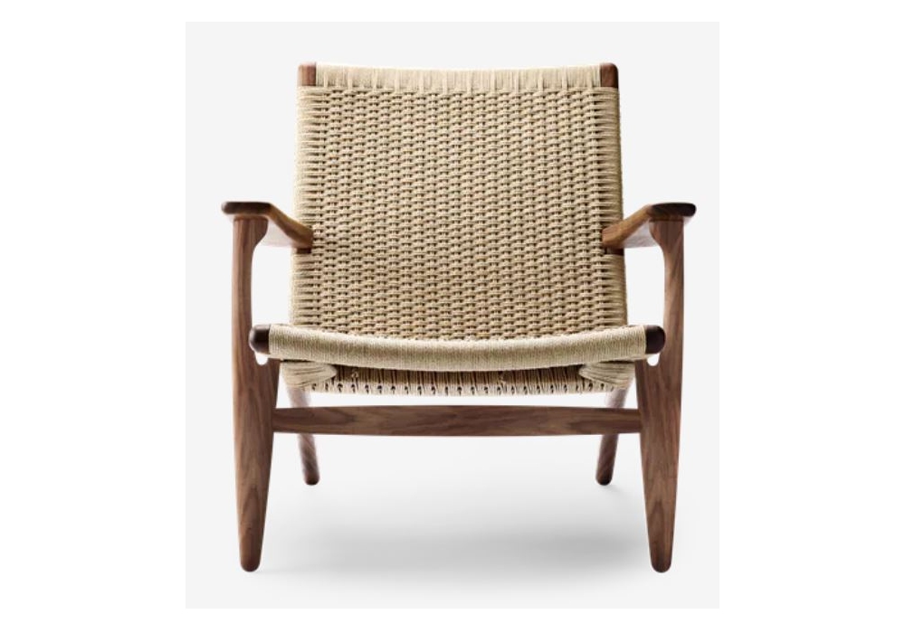 CH25 von Hans J. Wegner für Carl Hansen & Søn entworfen, ist ein Sessel mit Massivholzstruktur verfügbar in Eiche oder Nussbaum in verschiedenen Ausführungen. Sitz und Rückenlehne aus natürlichem oder schwarzem Seil.