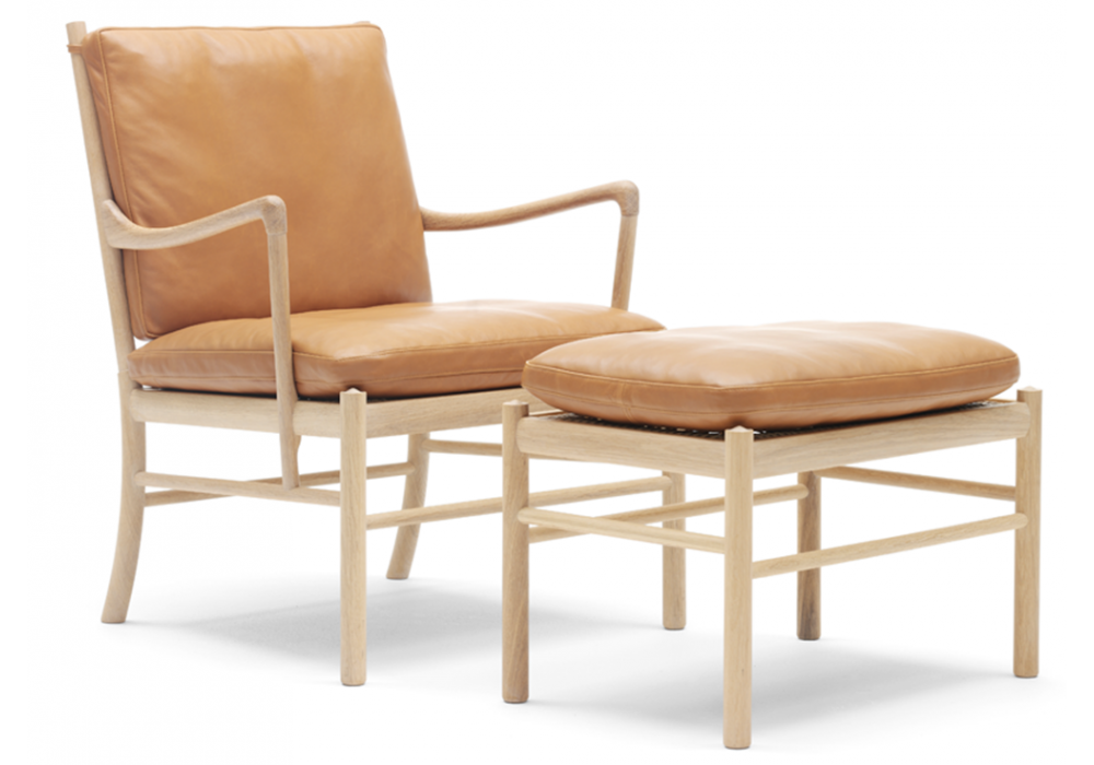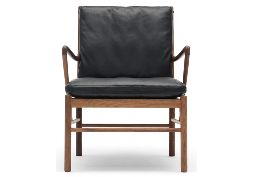 OW149 Colonial Chair von Ole Wanscher für Carl Hansen & Søn entworfen, ist ein Sessel mit Gestell aus massiver Eiche oder Nussbaum in verschiedenen Ausführungen. Gepolsterter Sitz und Rücken mit Stoff- oder Lederbezug.