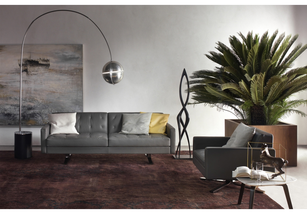 Kennedee, von Jean-Marie Massaud für Poltrona Frau entworfen, ist ein drehbarer Sessel mit 4-Speichen-Fuß aus gezogenem Stahl in gunmetalgrauem Finish. Der Drehmechanismus ermöglicht die Drehung um 90° und die automatische Rückkehr in die Ausgangsposition. Polsterung aus Leder pelle Frau®.