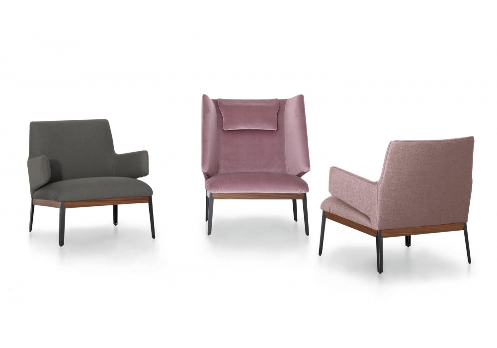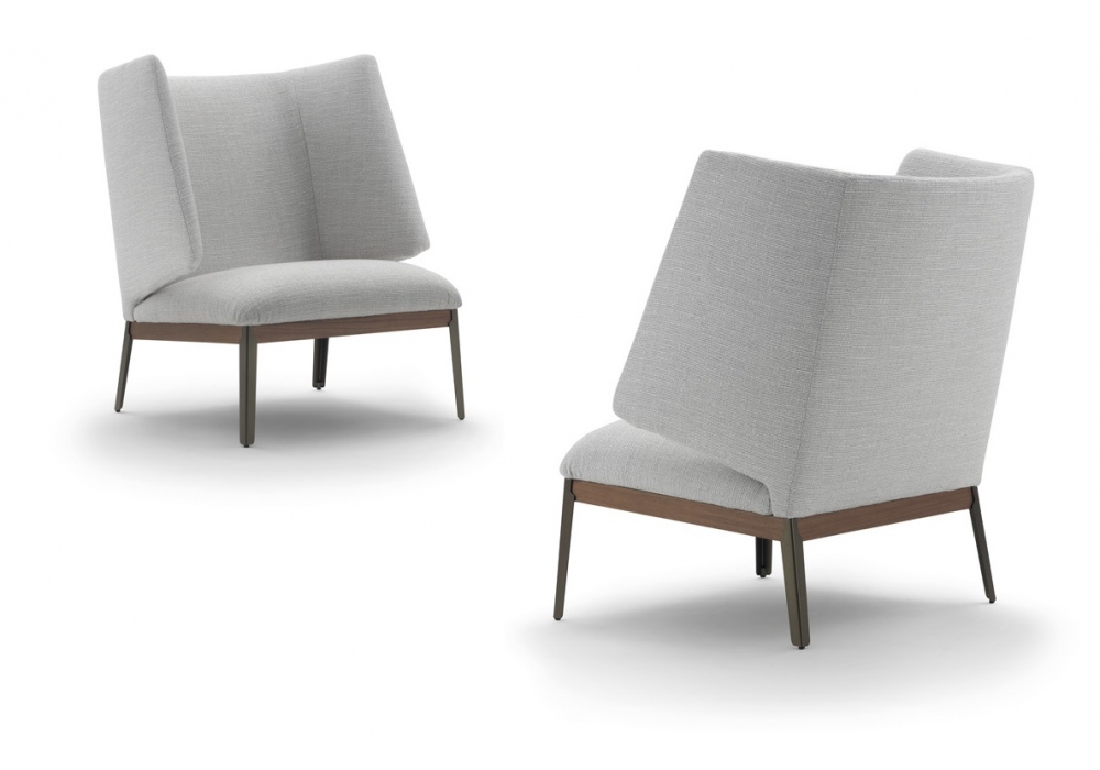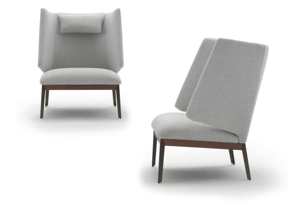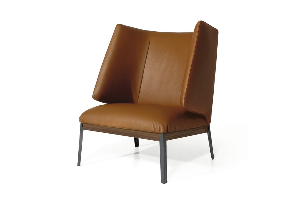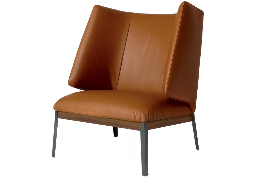 Hug von Claesson Koivisto Rune für Arflex entworfen, ist ein hoher Sessel mit lackierter Metallbasis und verstellbaren Füßen aus schwarzem PVC. Profile aus Canaletto-Nussbaum, Wenge, Eiche oder schokoladenfarbenem Holz. Stoff- oder Lederpolsterung.