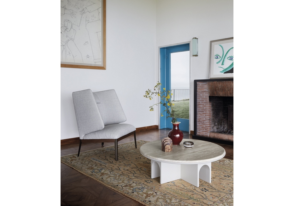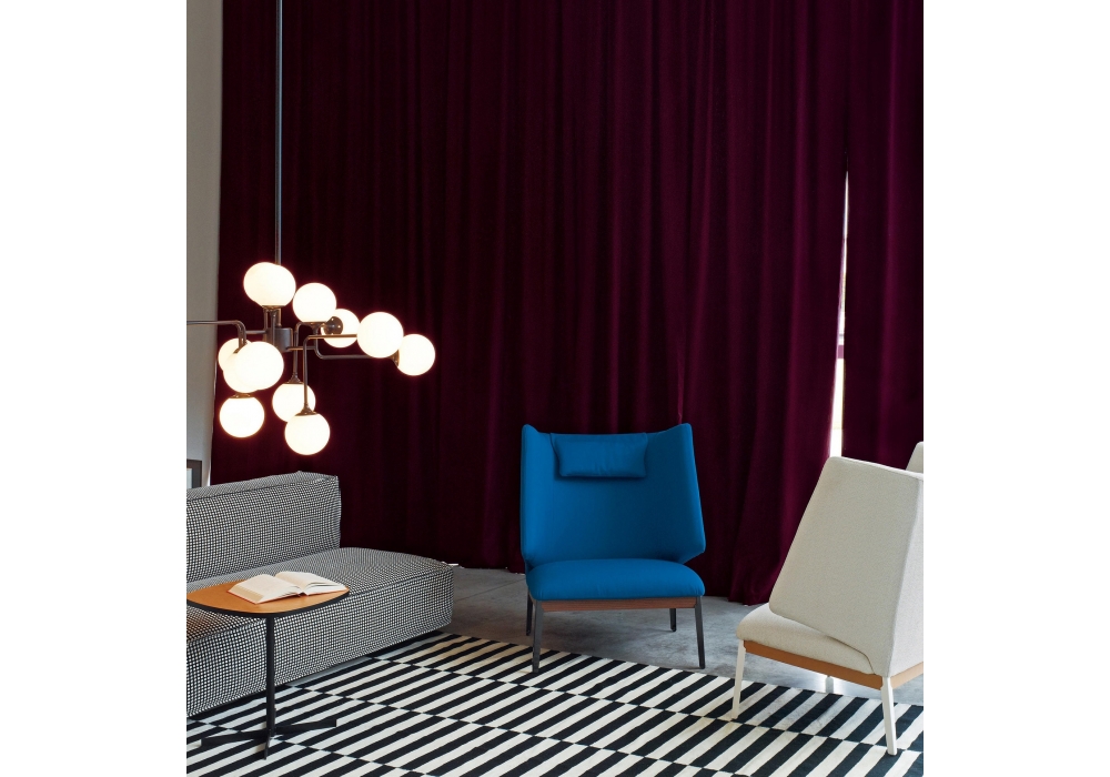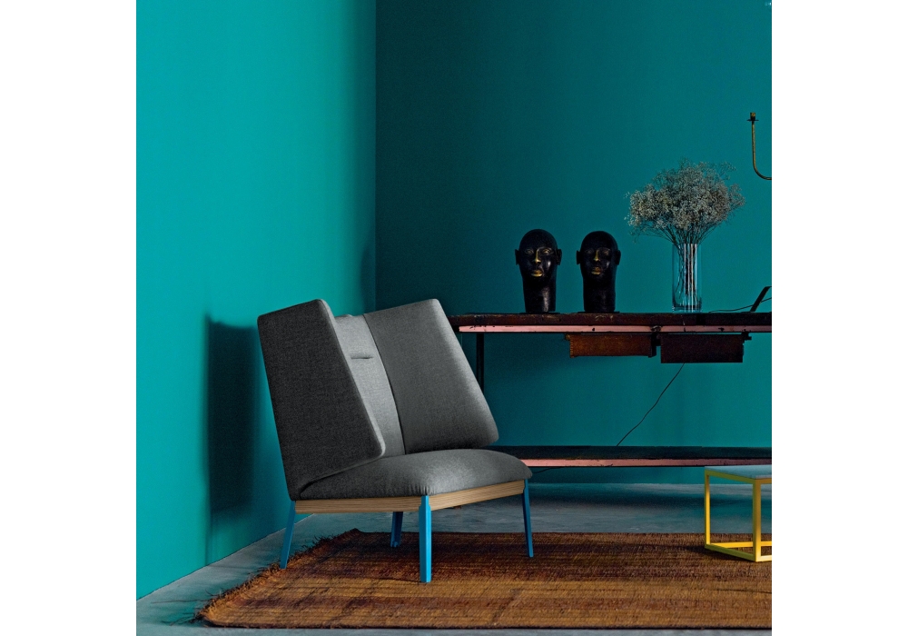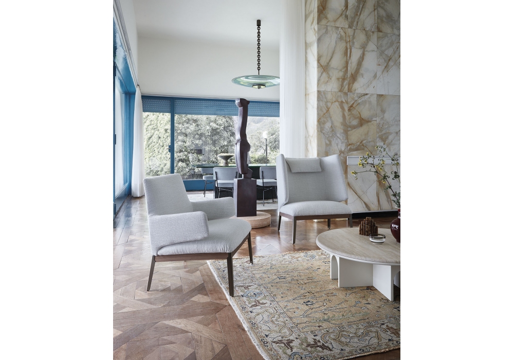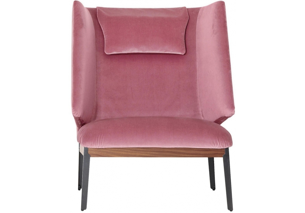 Hug von Claesson Koivisto Rune für Arflex entworfen, ist ein hoher Sessel mit lackierter Metallbasis und verstellbaren Füßen aus schwarzem PVC. Profile aus Canaletto-Nussbaum, Wenge, Eiche oder schokoladenfarbenem Holz. Stoff- oder Lederpolsterung.