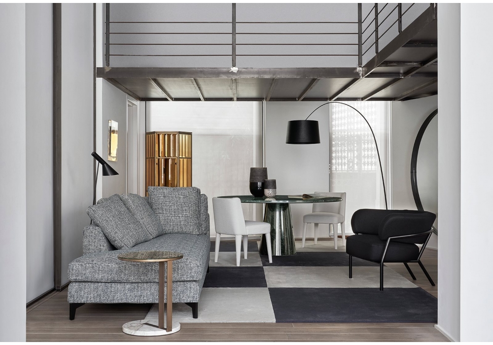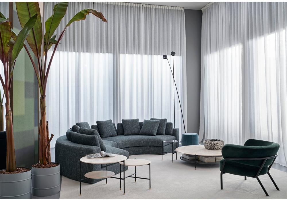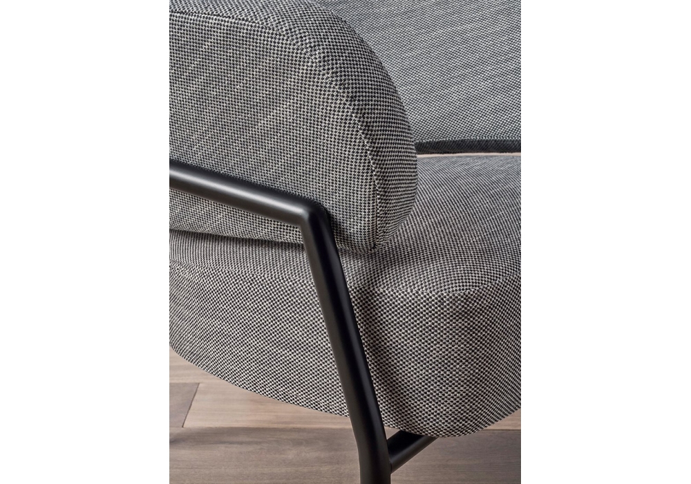 Nanì von Andrea Parisio für Meridiani entworfen, ist einer Sessel mit lackierten Metallstruktur, Polsterung aus Polyurethanschaum mit unterschiedlichen Dichten und Polyesterfaser und Polsterung in Stoff oder Leder.