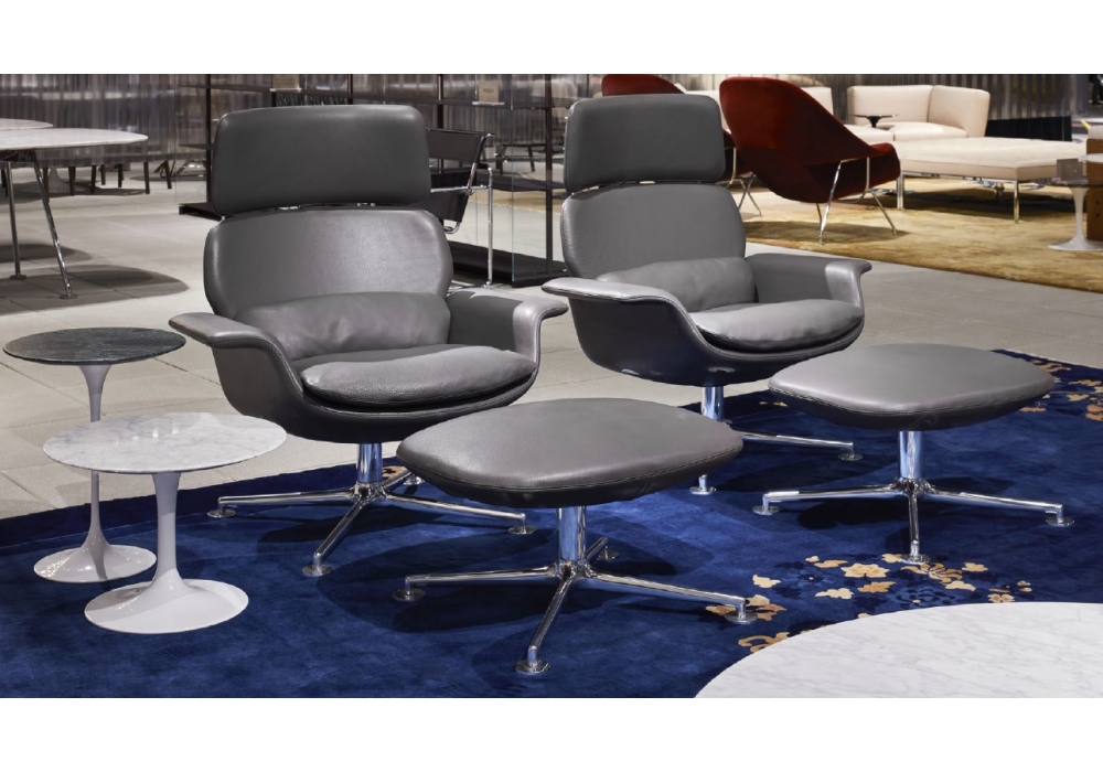 KN von Piero Lissoni für Knoll entworfen, ist ein Drehsessel mit verstellbarer Rückenlehne. Basis aus poliertem oder lackiertem Aluminiumdruckguss und Polsterung in einer breiten Palette von Stoffen und Ledern. KN kann mit einer Fußstütze für mehr Komfort ergänzt werden.