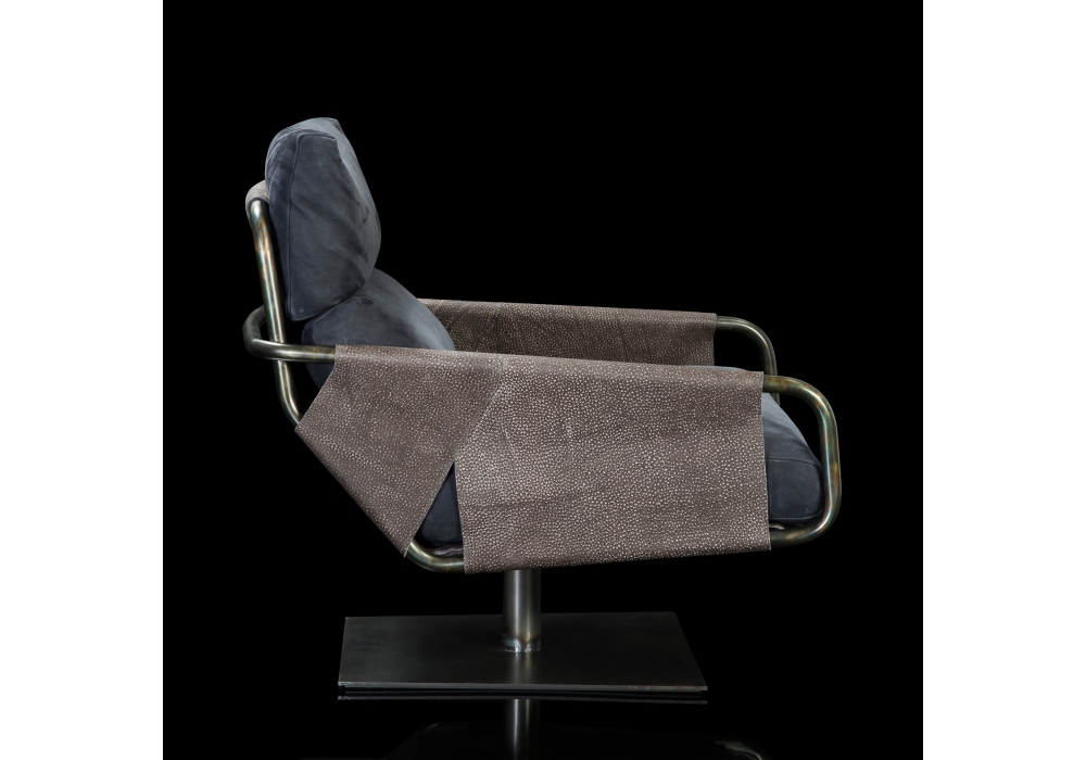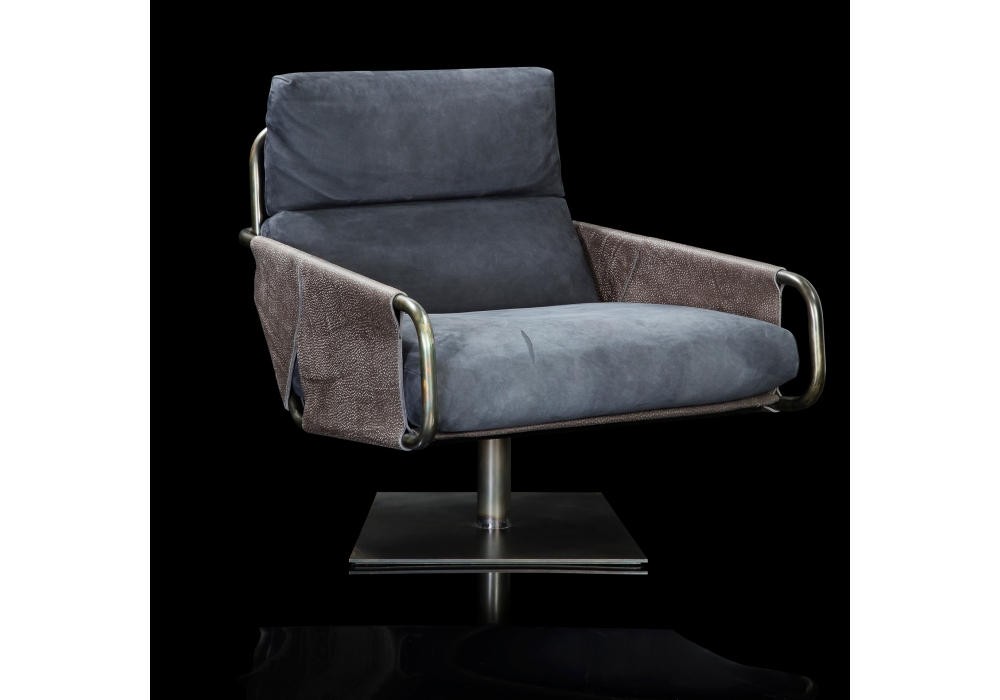 Voyage von Massimo Castagna für Henge entworfen, ist ein Sessel mit Bezug aus Leder. Röhrenförmige Metallgestell aus schwarz brüniert, Titanio brüniert oder brüniertes Platino. Schale aus gewebtem, lasergeschnittenem Leder.