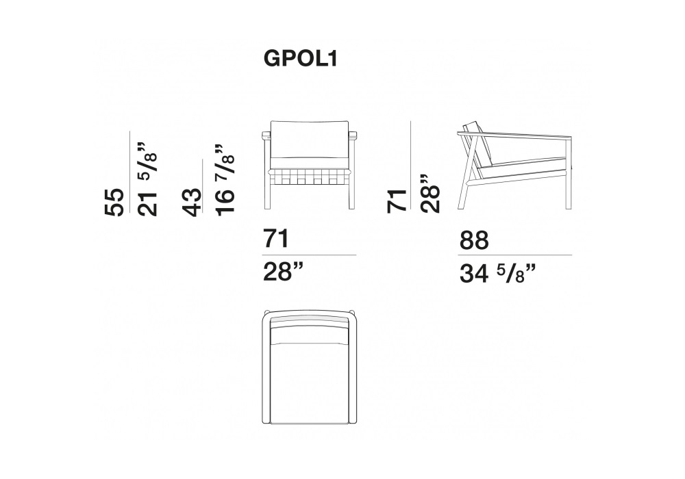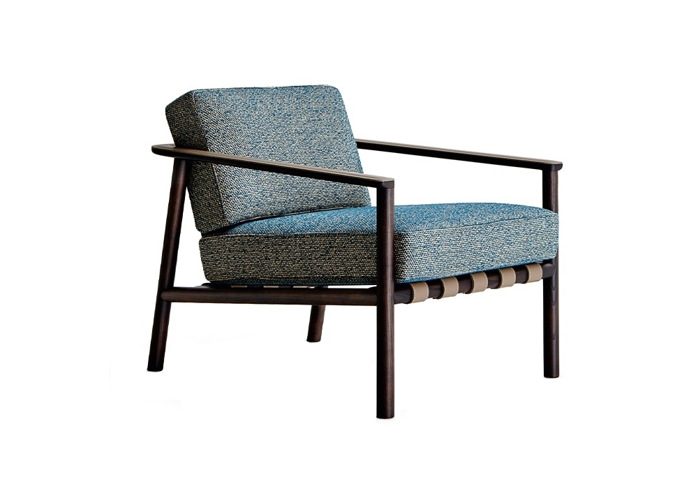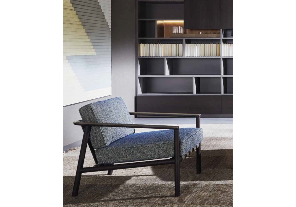 Gillis von Vincent Van Duysen für Molteni&C entworfen, ist ein Sessel mit Gestell aus Eukalyptus gebeizter asche. Die Sitz- und Rückenkissen werden auch von elastischen Riemen aus gebundenem Leder getragen.