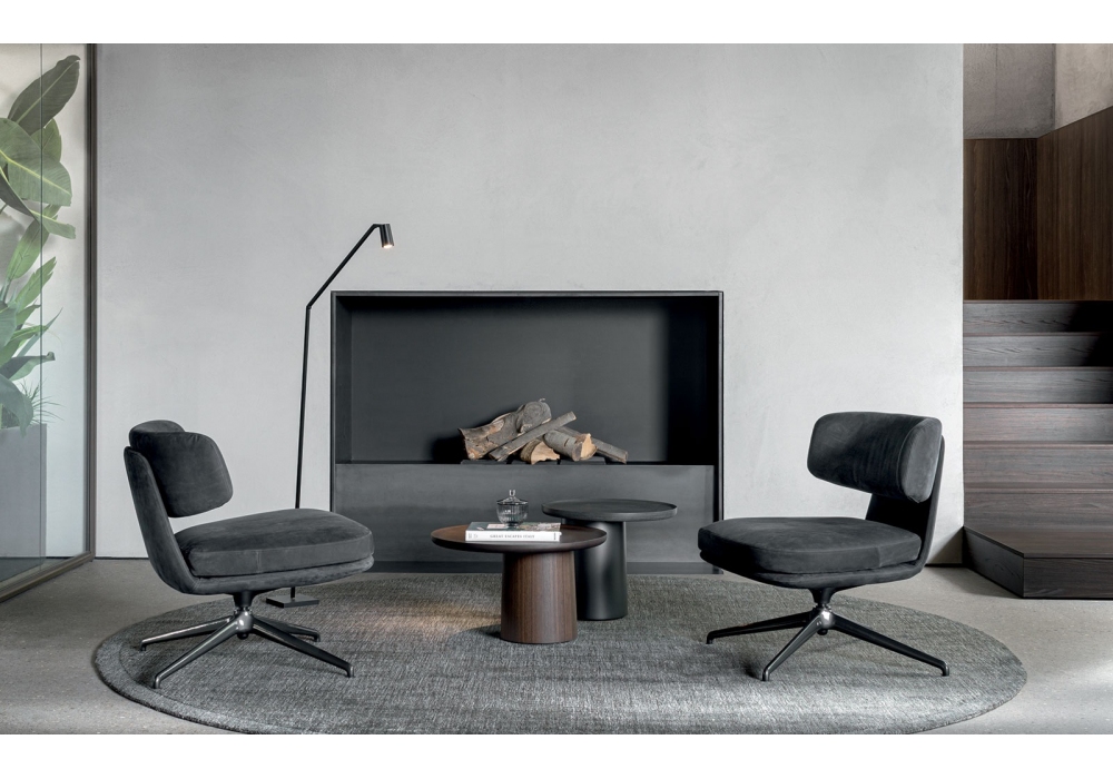 Piccadilly von Rodolfo Dordoni für Molteni&C entworfen, ist ein Sessel mit drehbarer Basis aus Aluminium oder Zinn und Polsterung aus Stoff oder Leder in mehreren Ausführungen. Verfügbar mit niedrigem oder hohem Rücken.