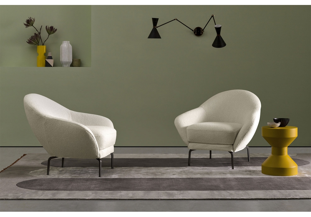 Giulia von Rita Consonni für Bodema entworfen, ist ein Sessel aus Stoff-, Samt- oder Lederpolstern und grau lackierten Metallfüßen. Verfügbar in mehreren Ausführungen.