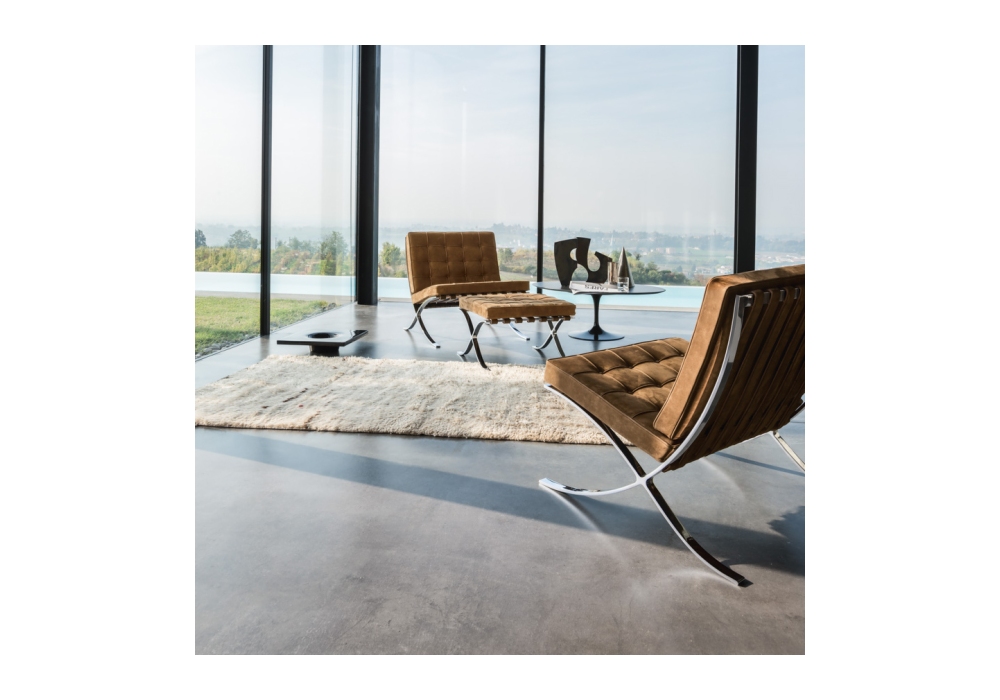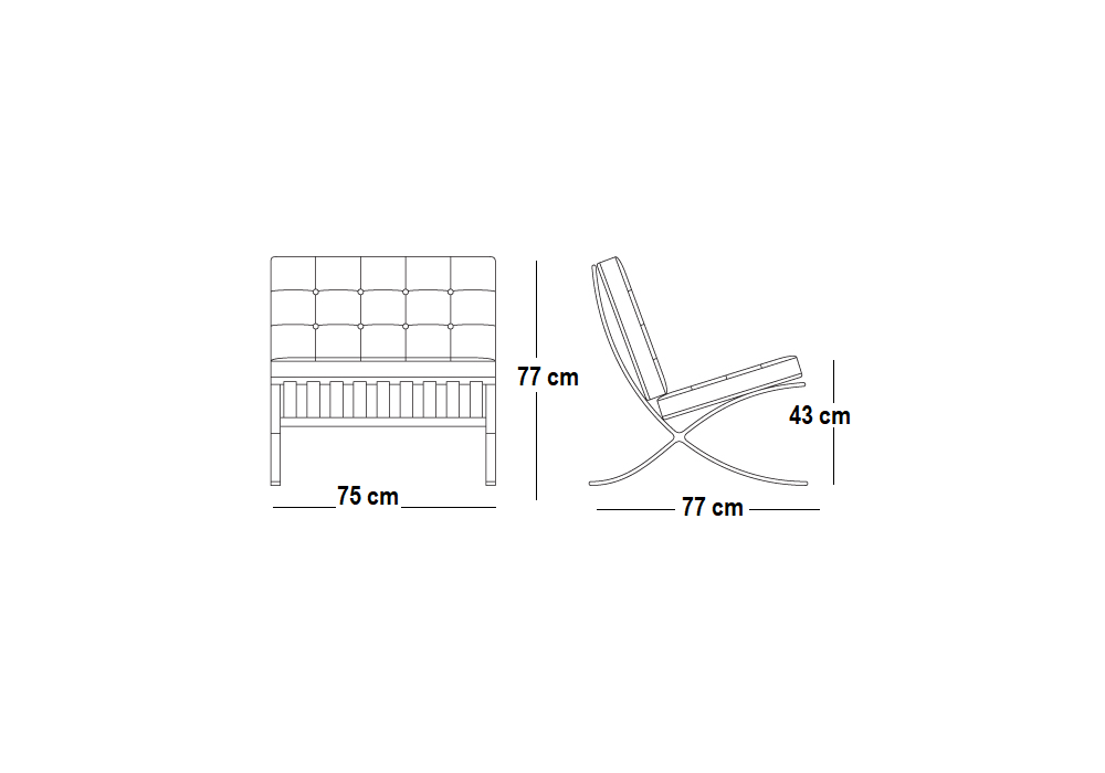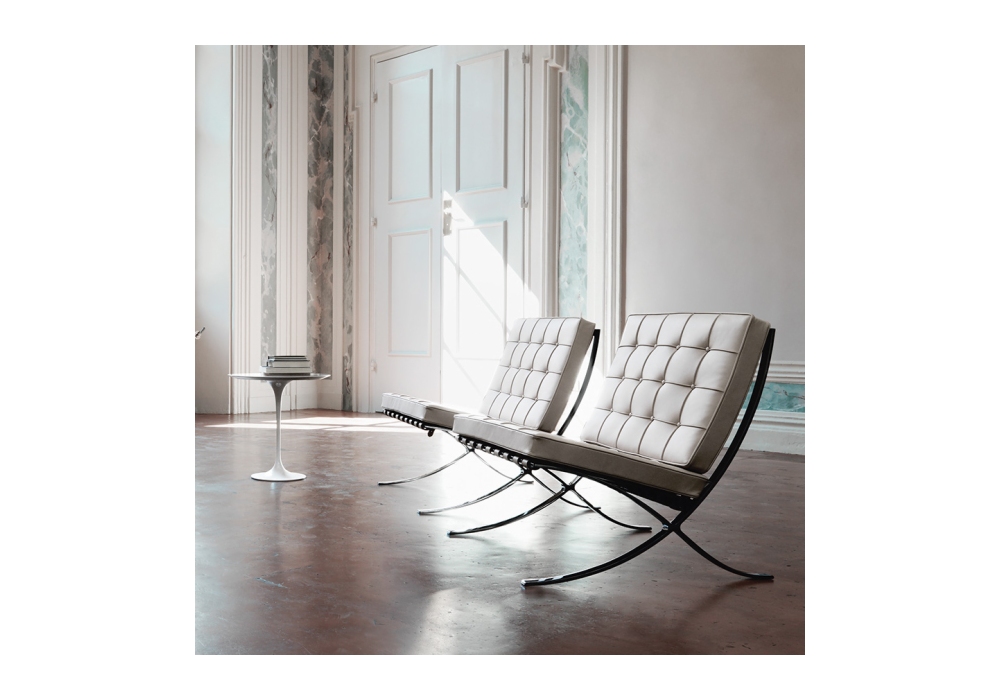 Barcelona von Ludwig Mies van der Rohe für Knoll entworfen, ist ein Sessel mit handgeschliffenem Chromstahl und handpoliertem, hochglanzpoliertem Gestell und Lederpolsterung. Es ist in verschiedenen Ausführungen erhältlich.
