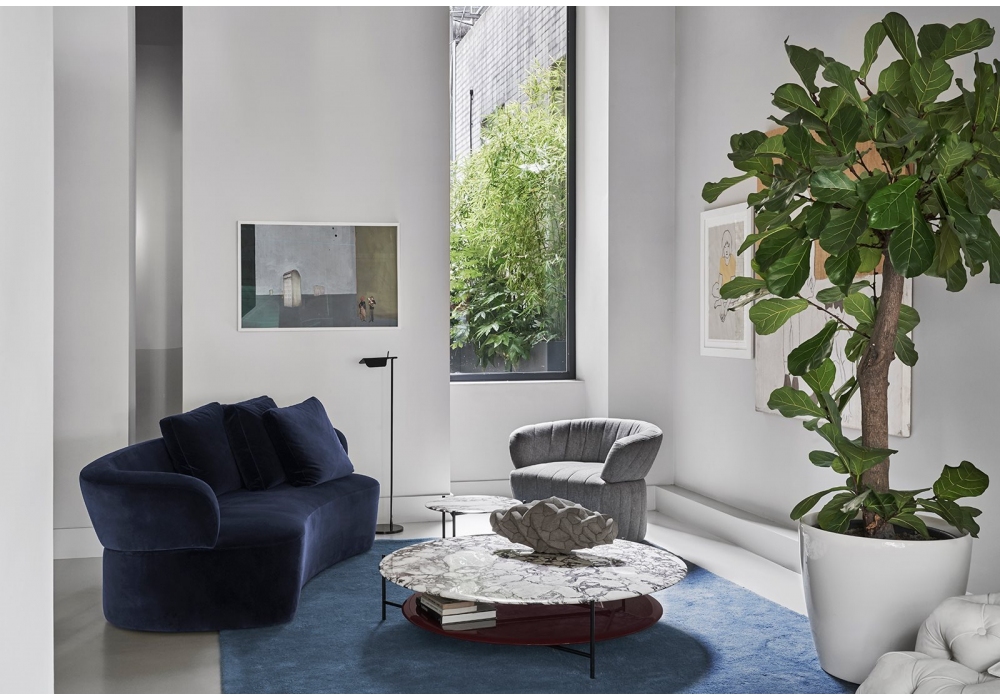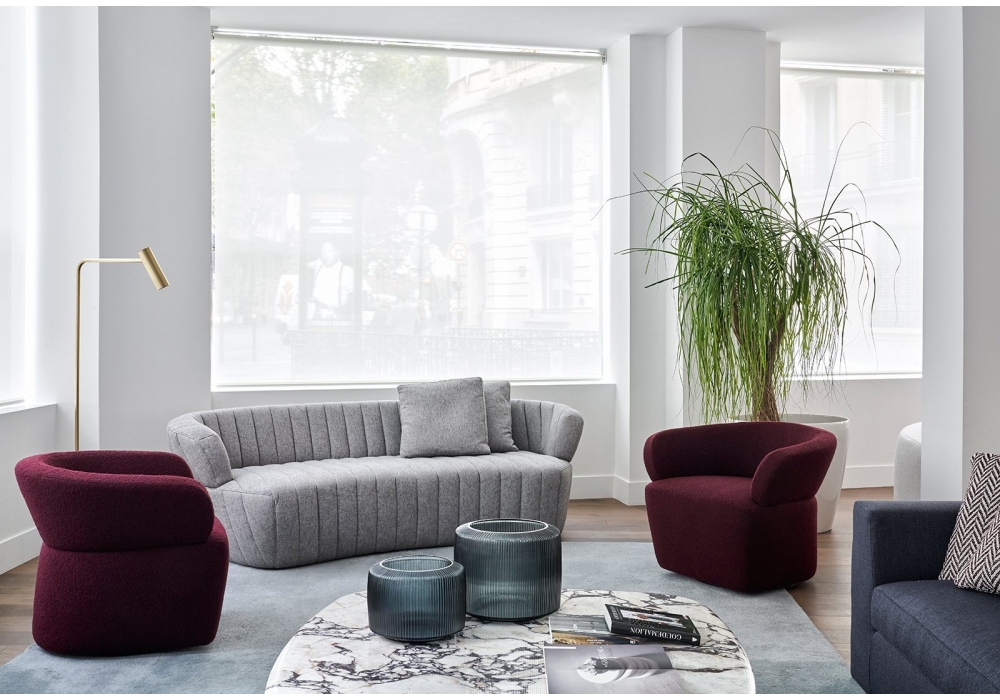 Josephine, von Andrea Parisio für Meridiani entworfen, ist ein Sessel mit Holzgestell und Polsterung aus unverformbaren PU-Schäumen. Bezug aus Stoff oder Leder. Drehbares Gestell aus Metall varnished matt.