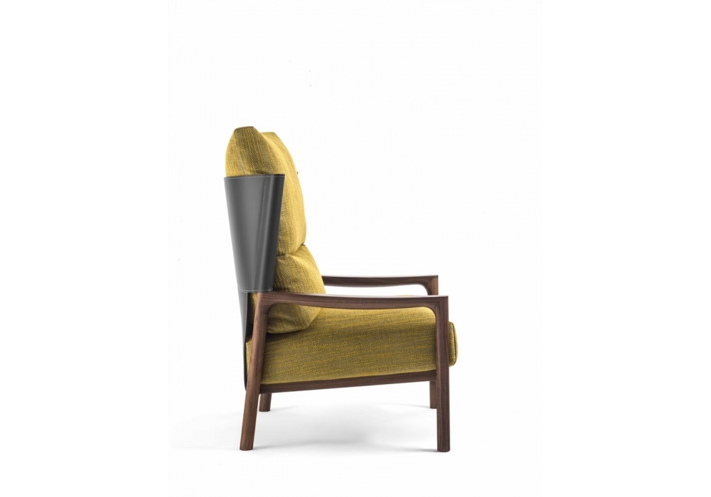 Vera Bergere von Gabriele & Oscar Buratti für Porada entworfen, ist einer Sessel mit Struktur in Canaletto Nuss, Rückenlehne in Cuoietto und Polsterung in Stoff.