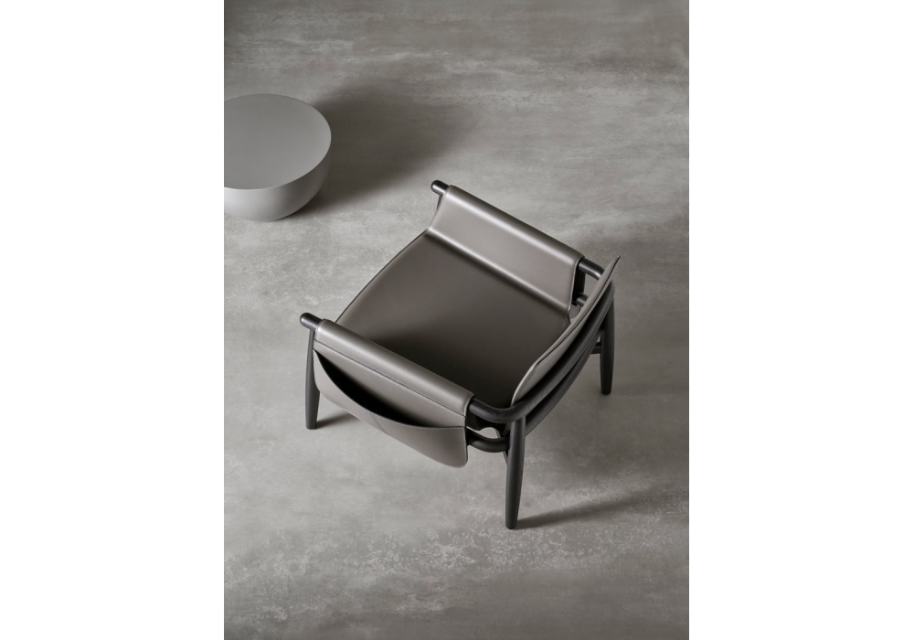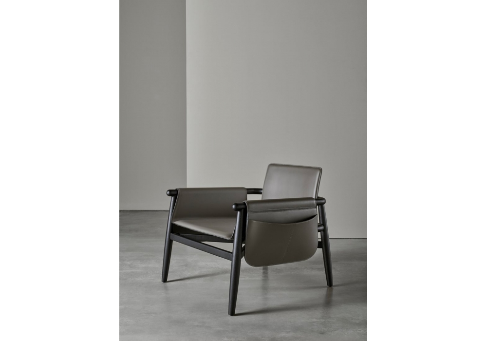 Teresa Kuoio, von Andrea Parisio für Meridiani entworfen, ist ein Sessel mit Gestell aus massiv Eichenholz gebeizt. Gleiter aus Kunststoff schwarze. Sitzen und Rücken mit Bezug aus Kernleder. Verfügbar mit integrierter Tasche aus Kernleder(Links, Rechts oder beide Seite).