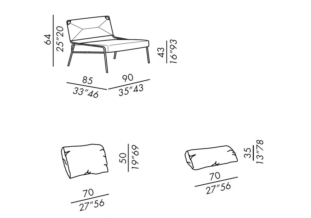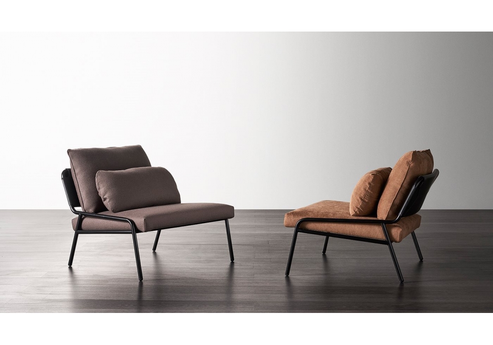 Zoe Kuoio, entworfen von Andrea Parisio für Meridiani, ist ein Sessel mit Gestell aus lackiertem Aluminium und Sitzkissen aus Polyurethan und Polyesterfaser. Rücken mit Kernleder bezogen.