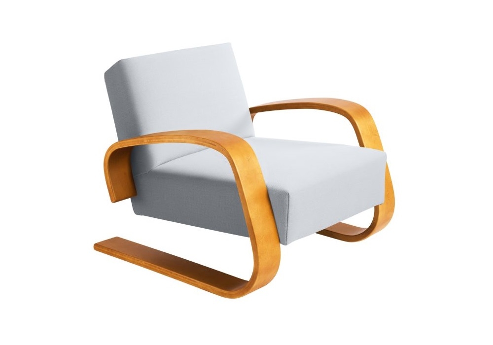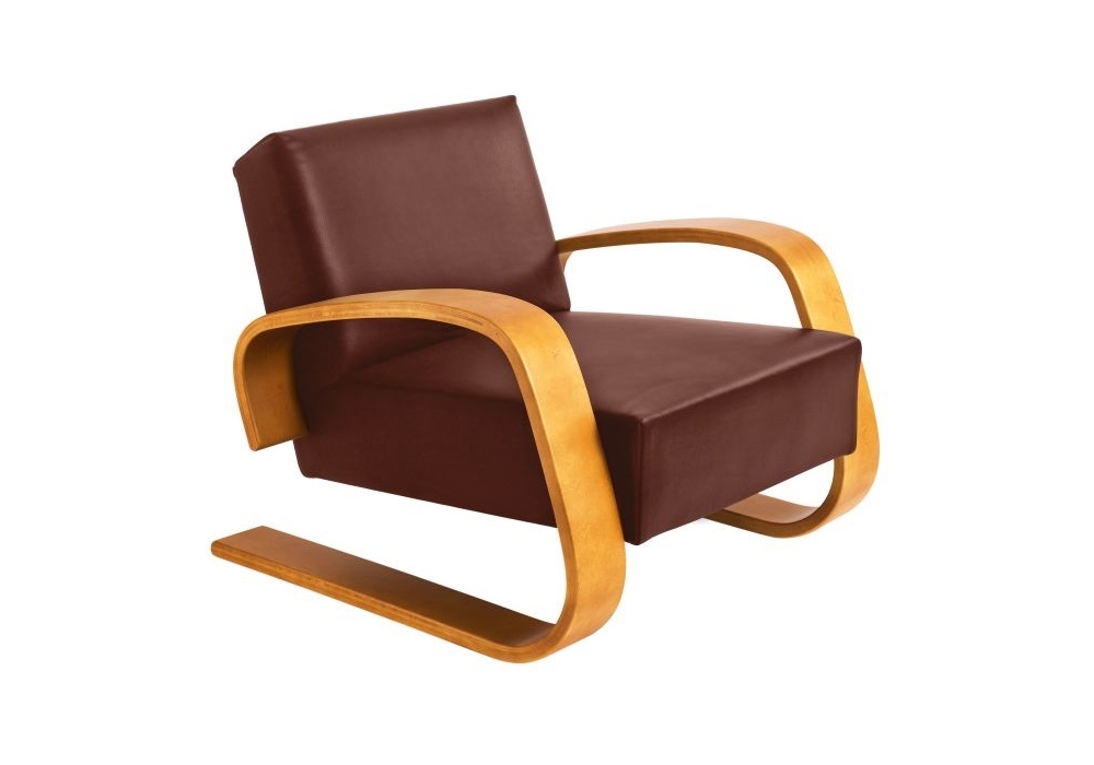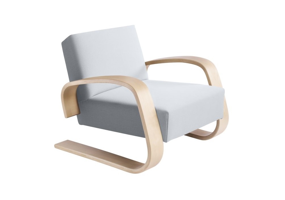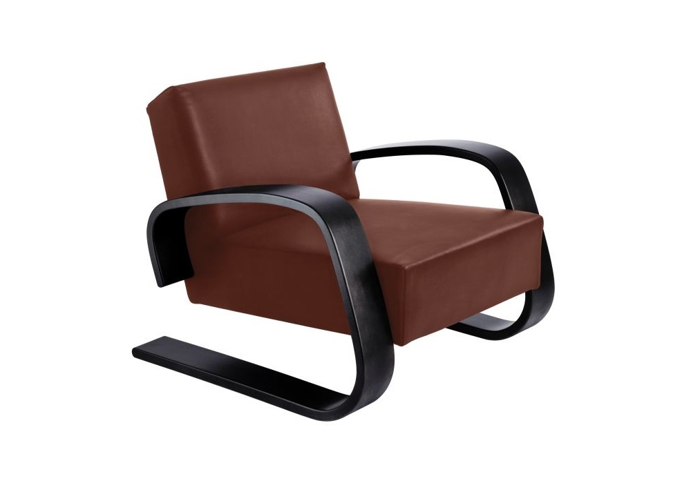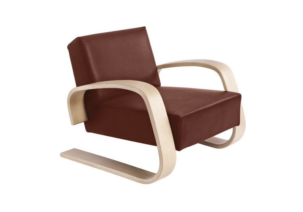 Armchair 400 "Tank" von Alvar Aalto für Artek entworfen, ist ein Sessel mit Polsterung aus Stoff oder Leder und gebeiztem oder lackiertem Gestell. Verfügbar in mehreren Ausführungen.
