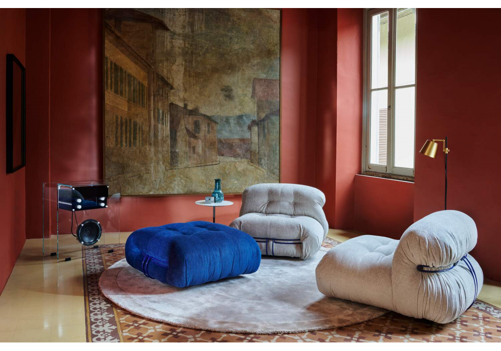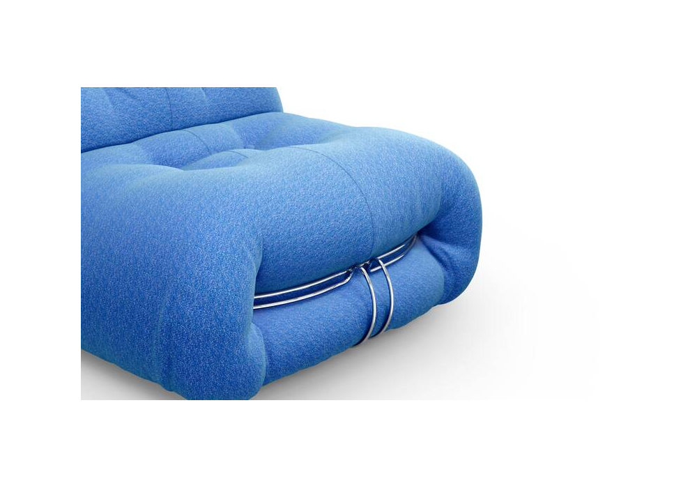 Soriana von Afra & Tobia Scarpa für Cassina entworfen, ist ein Sessel mit Polsterung aus 100% recyceltem PET oder Watte. Struktur aus lackiertem Metall und Polsterung aus Stoff oder Leder. Auch in der Chaiselongue-Version erhältlich.