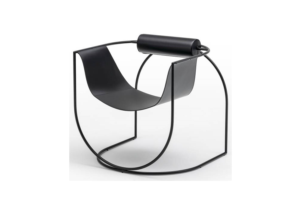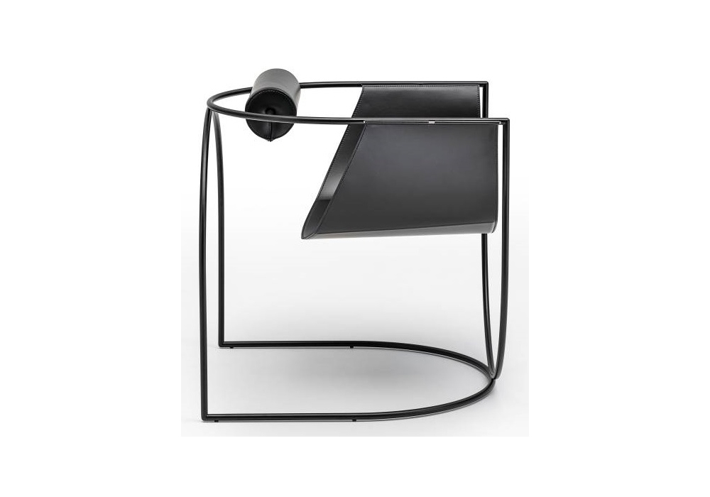 Lemni von Marco Lavit für Living Divani entworfen, ist ein Sessel mit Tragstruktur aus Stahlrohr Ø16 mm, lackiert mit Epoxidpulvern in RAL-K7-Ausführung, 9017 mattschwarz. Sitz und Rollkissen mit Leder oder Pelle Cuoietto bezogen.