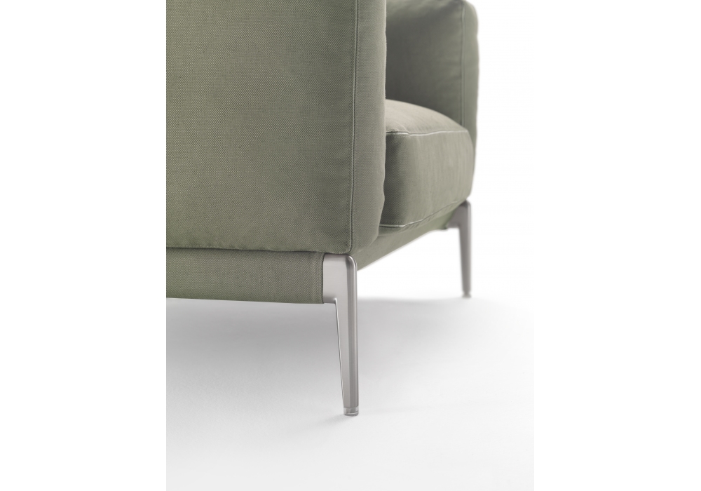 Romeo Compact von Antonio Citterio für Flexform entworfen, ist ein Sessel, der aus einer mit Polyurethan gepolsterten Metallstruktur, einer mit Polyurethan und Gänsedaunen gepolsterten Metallrückenlehne und Armlehne, Aluminiumfüßen und Leder- oder Stoffpolstern besteht.