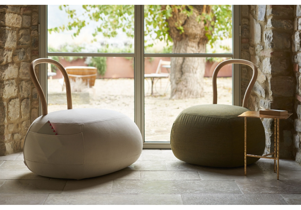Yum Yum von Lapo Ciatti für Opinion Ciatti entworfen, ist ein Sessel mit Rückenlehne aus gebogenem, gebleichtem massivem Eschenholz und abnehmbarem Bezug aus Stoff oder Leder. Verfügbar in mehreren Ausführungen und Abmessungen. Optional Bezug für die Rückenlehne im gleichen Stoff.